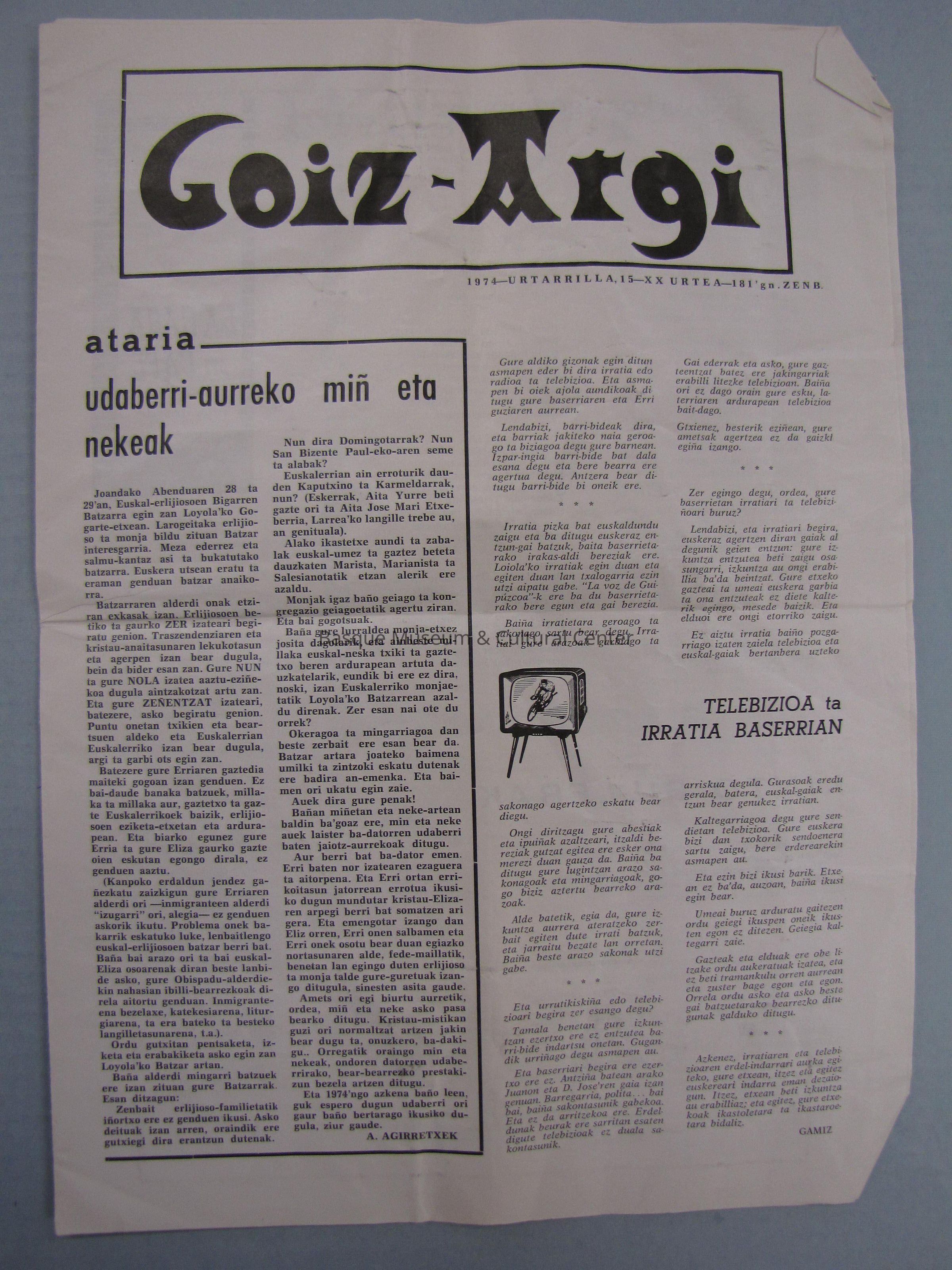Newsletter printed in Donostia; Printed in Basque; News about Television and Radio, Tolosa, Chile, Watergate, and Parents and Schools; advertisements throughout.