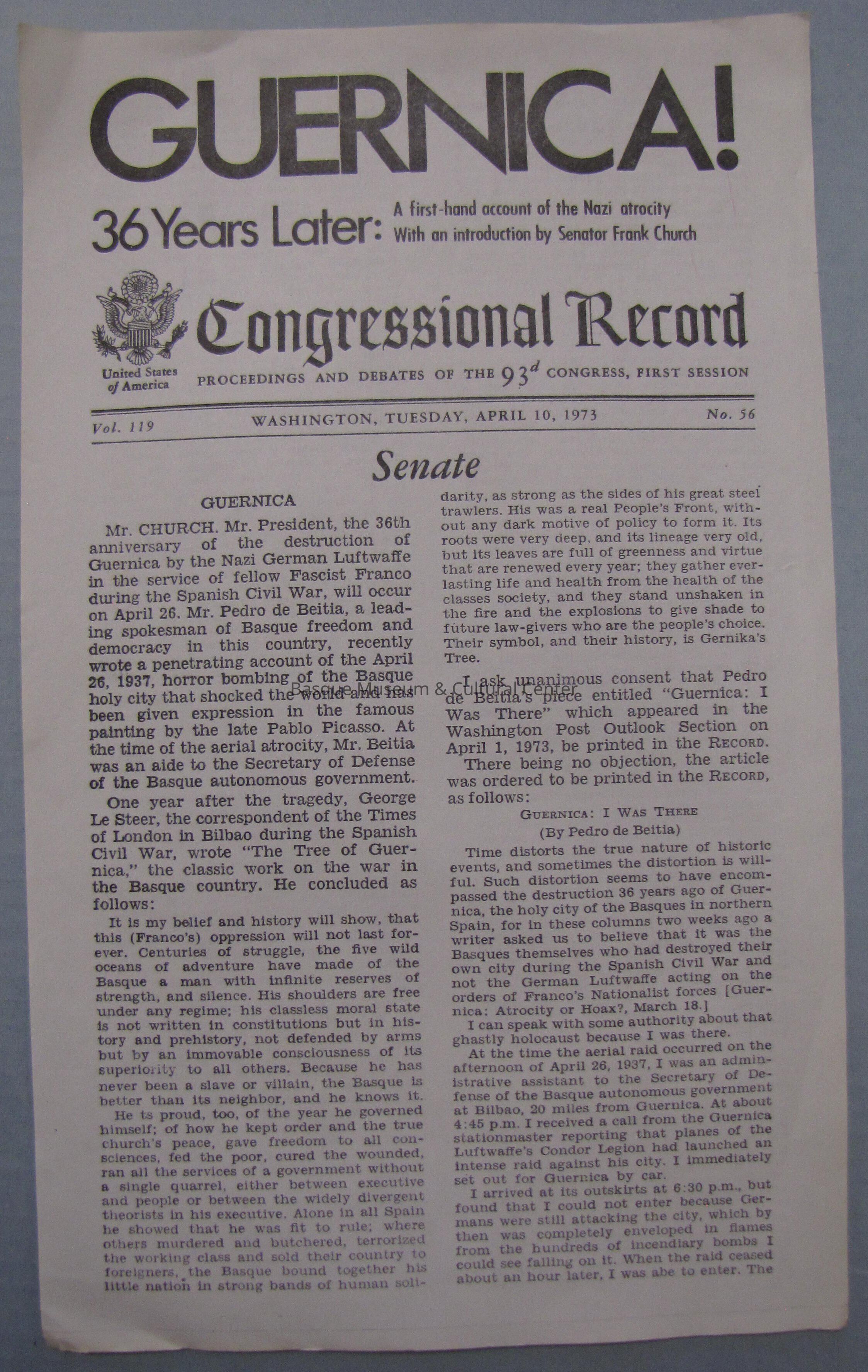 Congressional Record; Proceedings and Debates of the 93rd Congress, First Session; Volume 119, Number 56; official proceedings of Congress on April 10, 1973; introduction by Senator Frank Church; he talks about the bombing of Guernica and the lasting effects it had; he quotes George Le Steer's "The Tree of Gerunica"; Pedro de Beitia's "Guernica: I Was There" is printed in full in this record; he presents his first hand account of the bombing and rejects the conspiracy thatt Gernika was destroyed by its own people; he states that Picasso was right in his depiction of the destruction of the city; the man who created the conspiracy theory, Jeffrey Hart only had one source which was a book published under Franco's ministry