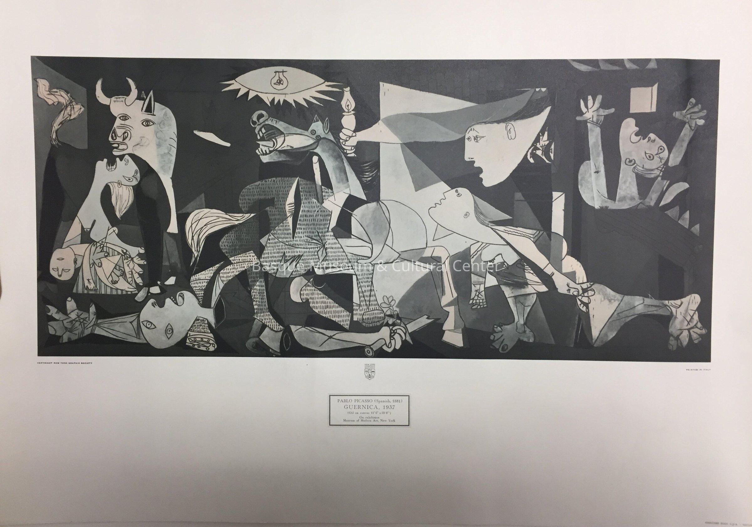 Color poster of a painting by Pablo Picasso - Guerica, 1937 - showing his interpretation of the aftermath of the bombing of Guernica in 1936. Copyright New York Graphic Society.