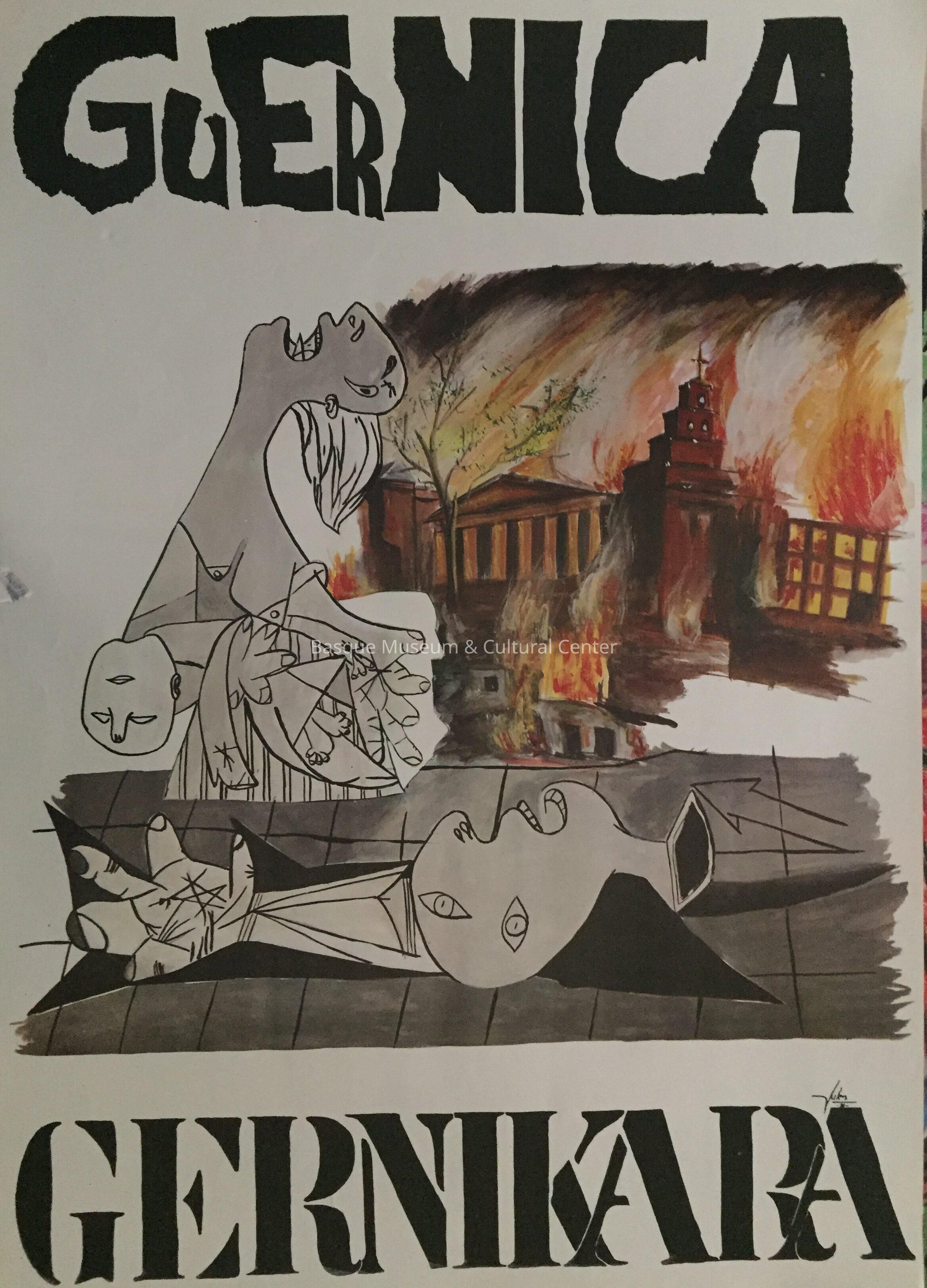 Full-color poster featuring a section of Pablo Picasso's painting, "Guernica" and a drawing of the parliament buildings in Guernica / Gernika burning.