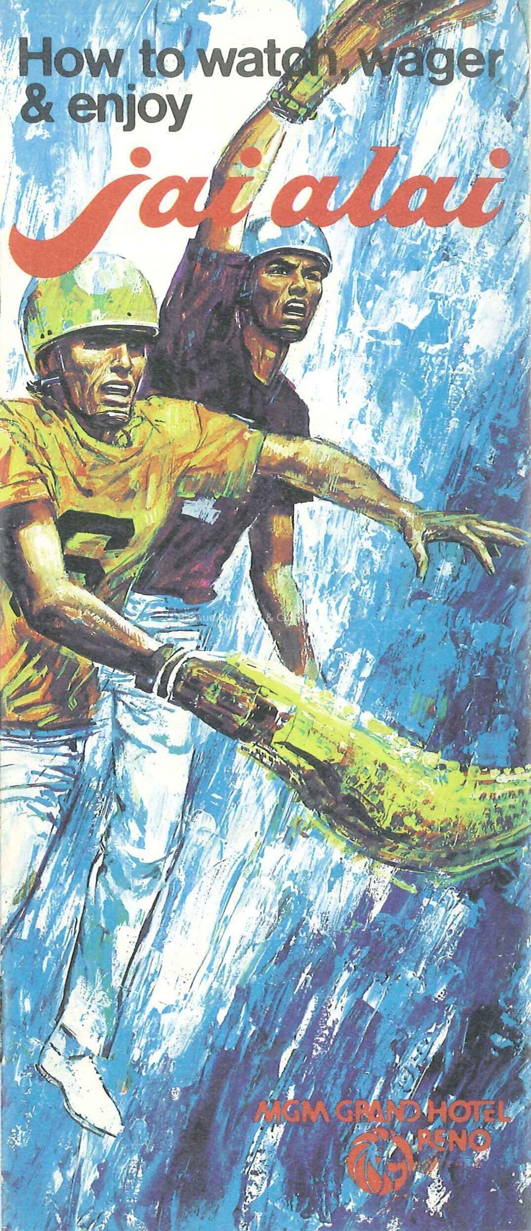 A pamphlet produced by the MGM Grand Hotel in Reno, Nevada. The pamphlet is entitled, "How to watch, wager, and enjoy Jai Alai."