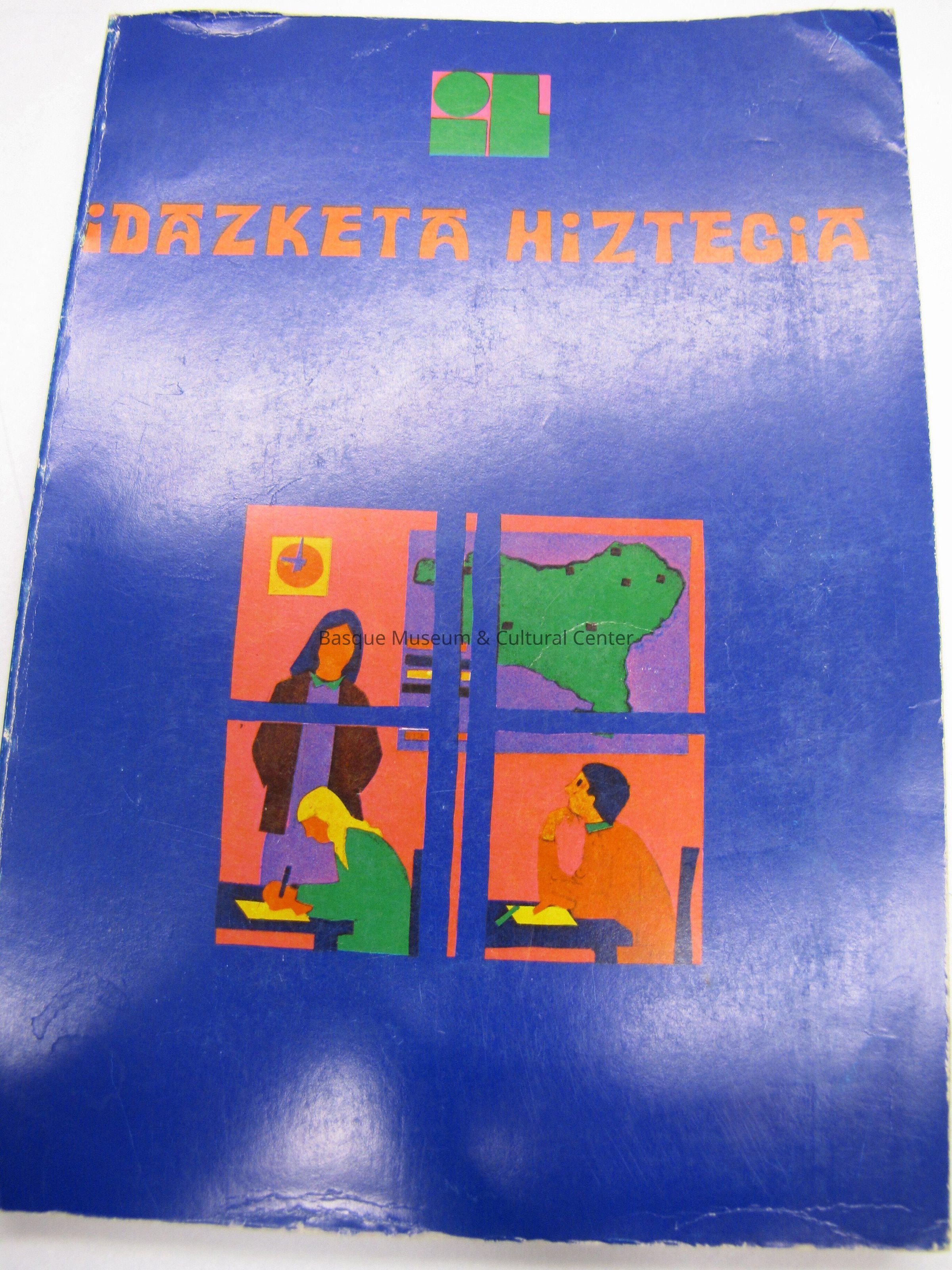 Bright blue cover with a bright pink, orange, purple, green, and yellow square picture broken up into fourths that has a teacher and two children and a map. The back is all plain white and the spine is blue with just the title on it. There is a stamp on the inside cover page that says Foreign Language Department. It looks like a Basque vocabulary book for children. There are 217 pages