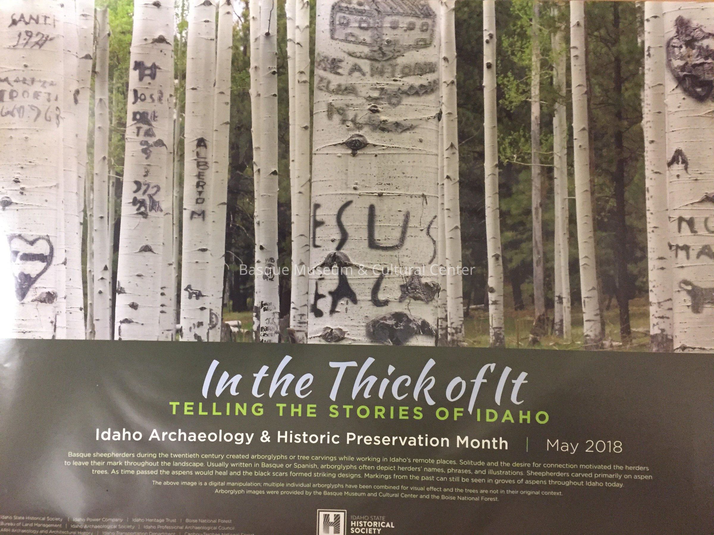 Color poster created for 2018 Idaho Archaeology & Historic Preservation Month by the Idaho State Historical Society and other sponsors. Features a composite photo of arborglyphs (some images provided by the Basque Museum & Cultural Center) in Idaho, with additional information about the event.