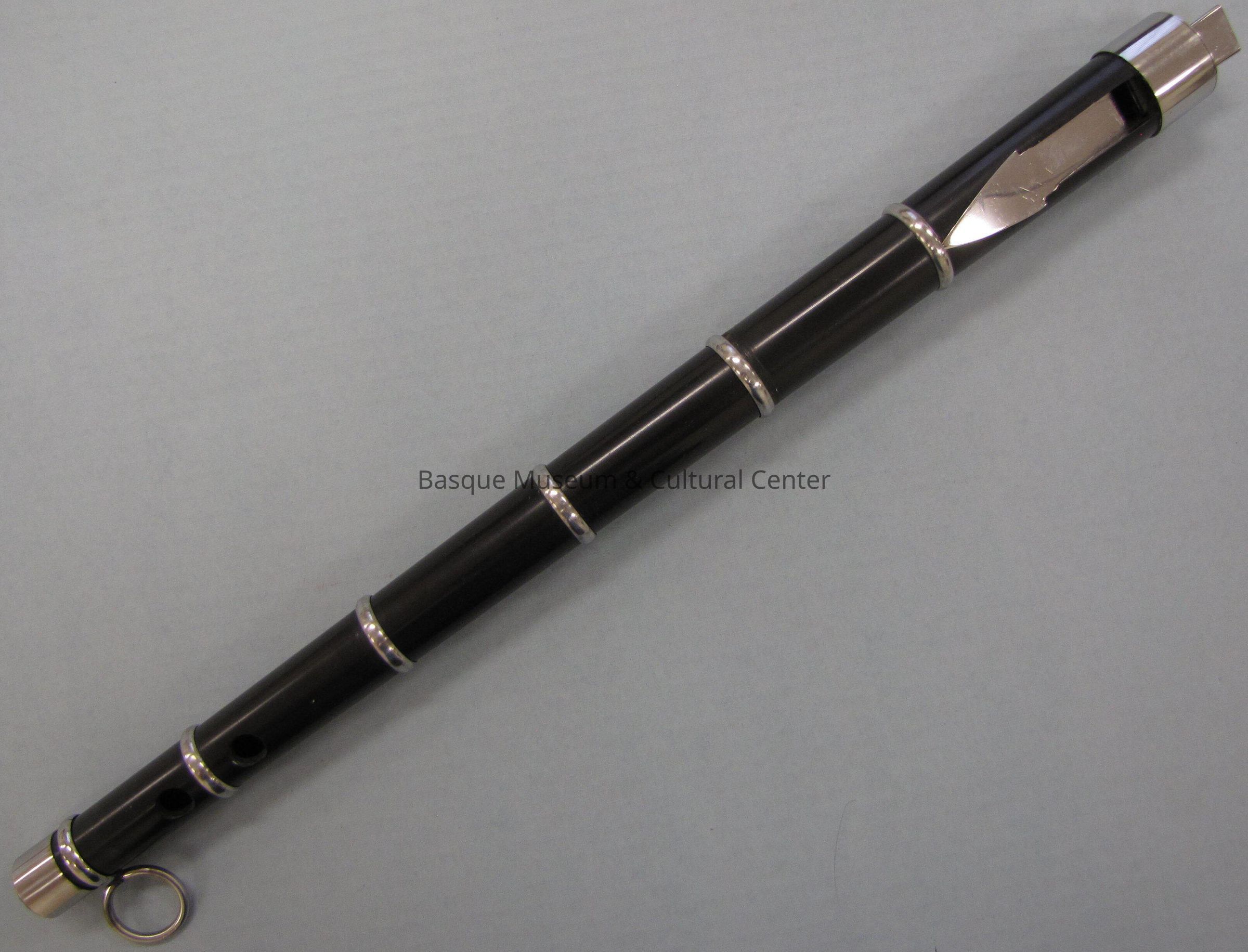 Standard txistu with no notable markings or differentiations: black with silver bands, cap, mouthpiece, plate, and ring; "INOX" is inscribed above the mouthpiece, and "PATENTADO M-85940" are inscribed below.