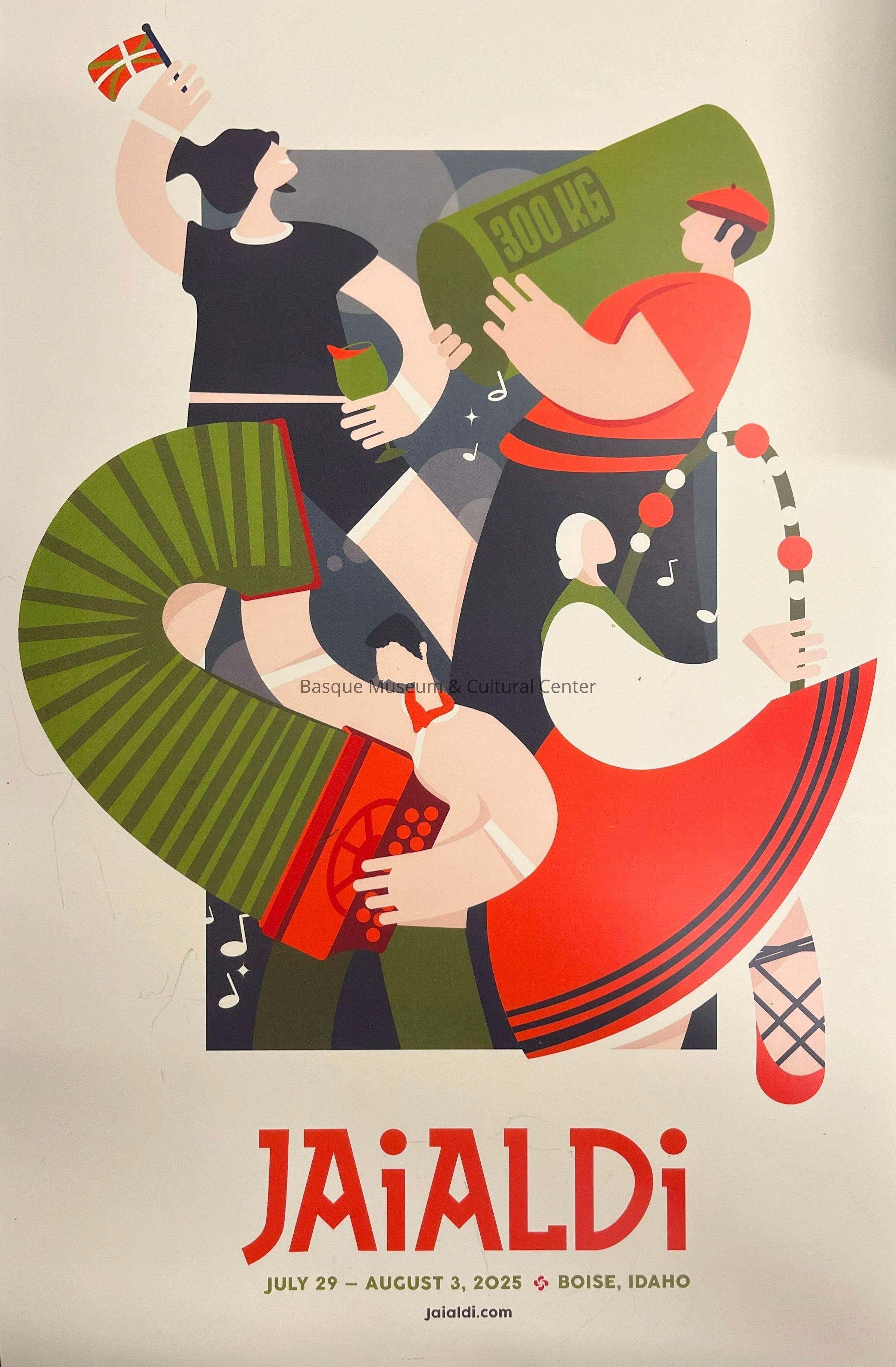 Full-color poster for Jaialdi, to be held July 29-August 3, 2025 in Boise, Idaho. Features a stylized dancer, accordion player and athletes, and web address for additional information.