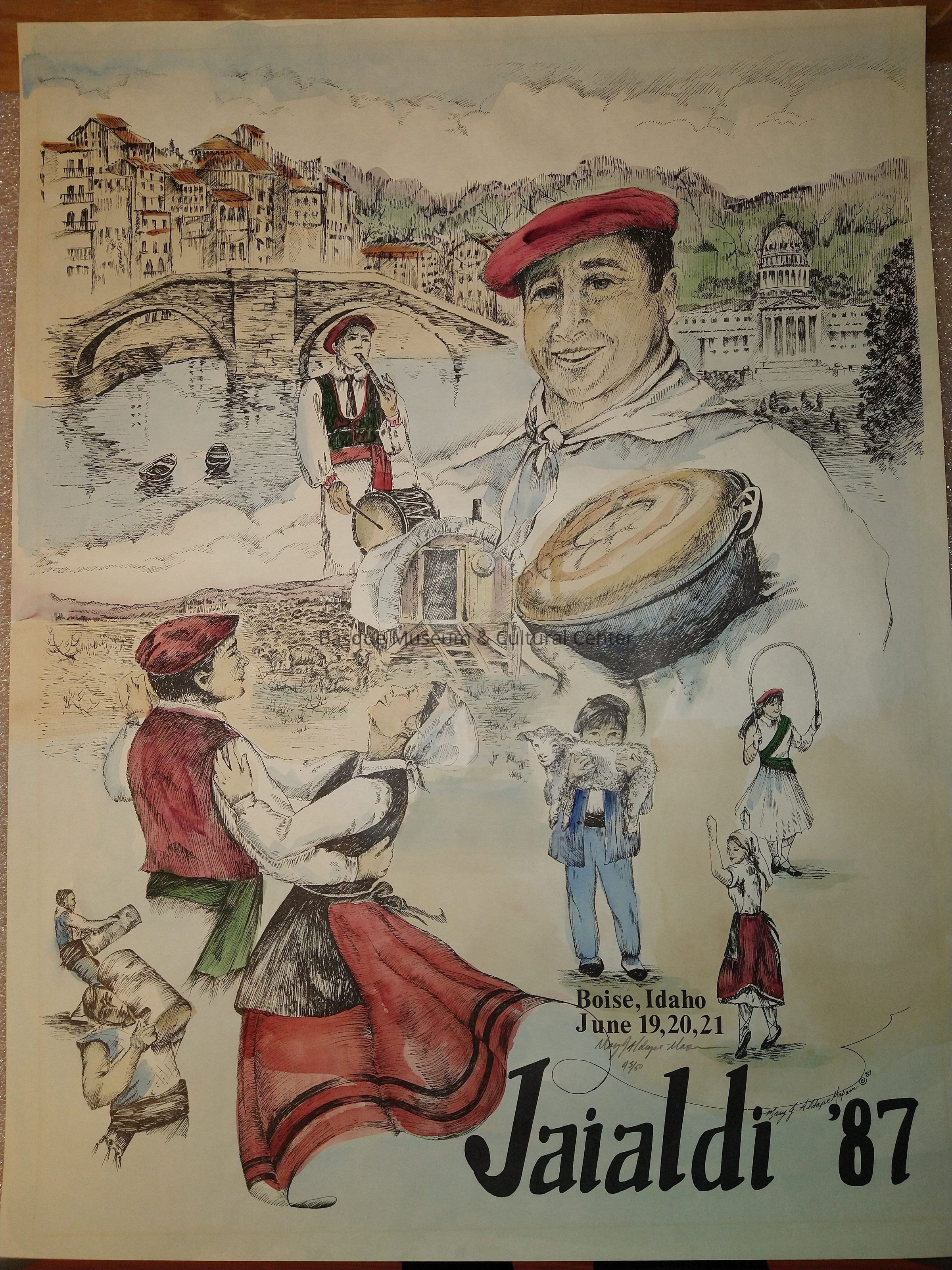 Hand drawn and colored poster promoting the 1987 Jaialdi festival in Boise. The poster depicts some of the different performances of the festival, including dancing and herri kirolak. A sheep wagon, the Boise capital building, and various other buildings can be seen in the background.