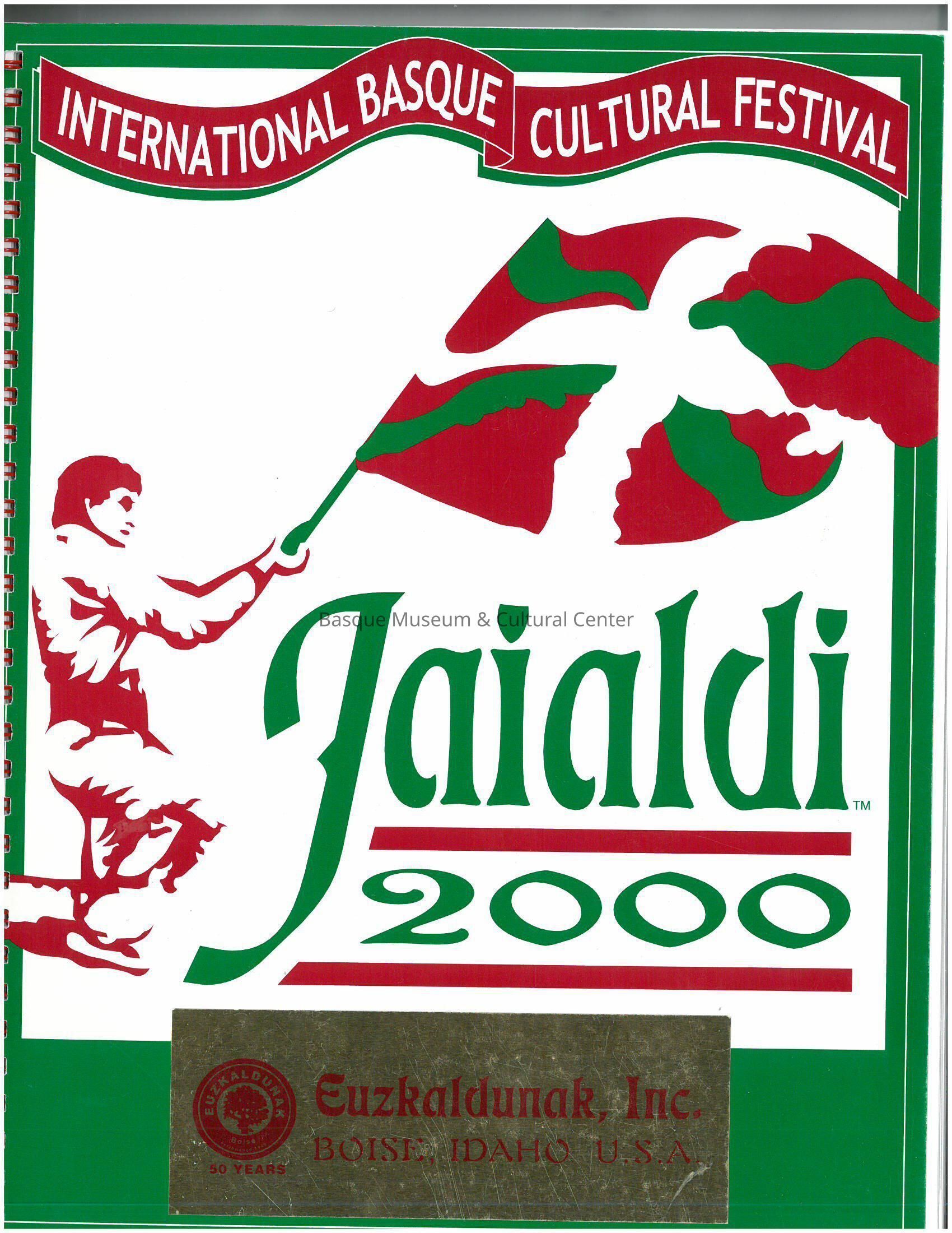 Event Program from Jaialdi 2000; International Basque Cultural Festival held on July 27-30 2000 in Boise, Idaho; hosted by Euzkaldnak Inc.; Program includes Jaialdi schedule, information about Basque culture and history, guests and performers, and advertisements/sponsers