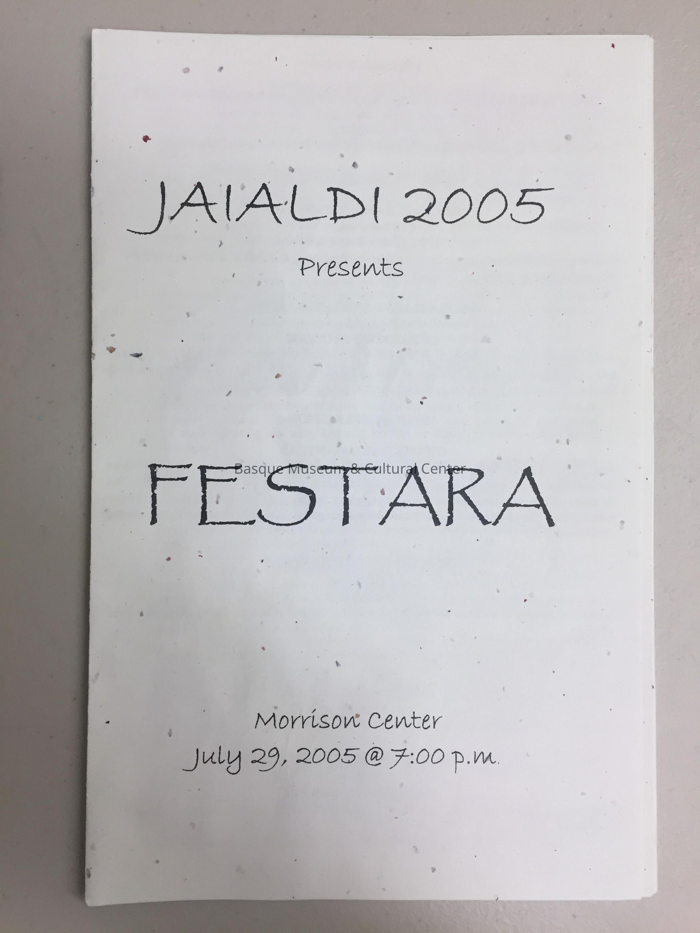Printed program from Festara, a musical event held as part of Jaialdi at the Morrison Center for the Performing Arts on July 29, 2005. Includes information about the musical and dance groups - Biotzetik Basque Choir, Oinkari Basque Dancers and Andra Mari Dantzari Taldea - the program itself; and acknowledgements.