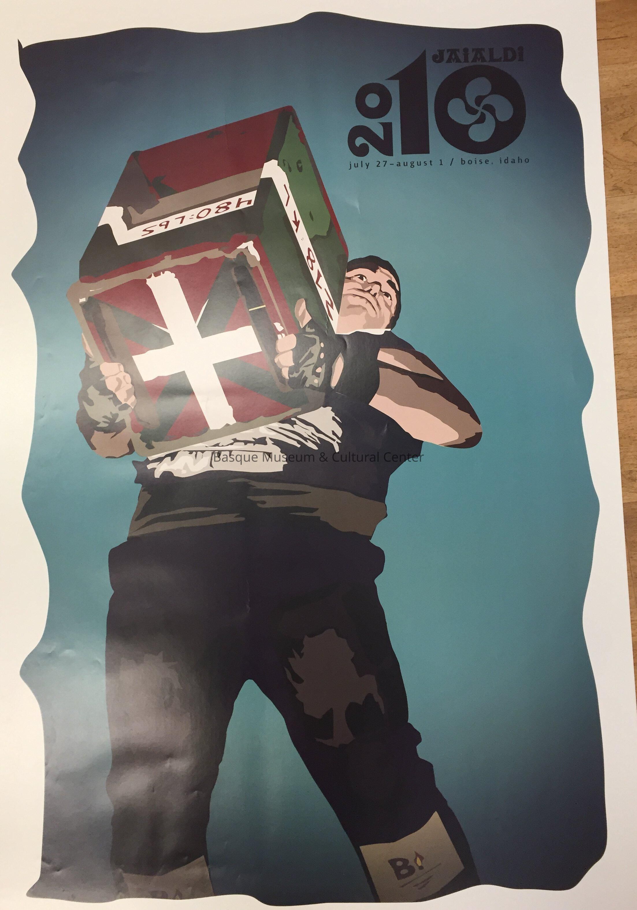 Color poster promoting Jaialdi 2010, July 27-August 1, in Boise, Idaho, featuring a male weight lifter.