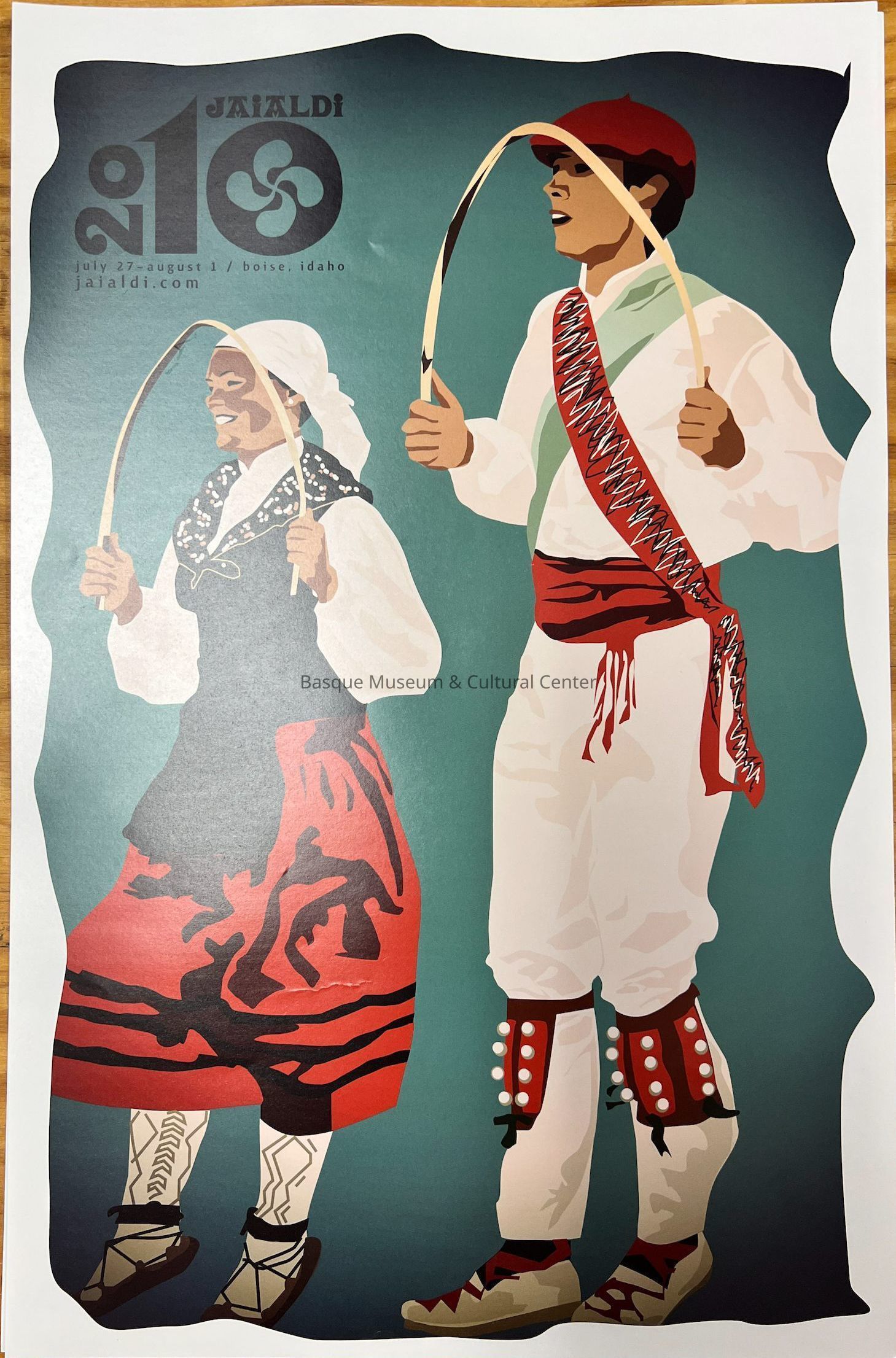 Full Color poster of the Jaialdi Festival held in Boise, Idaho July 27- August 1, 2010.Illistration of two Oinkari dancers in Basque dance costume doing a hoop dance. Includes Jaialdi title and dates are up in the left hand corner.