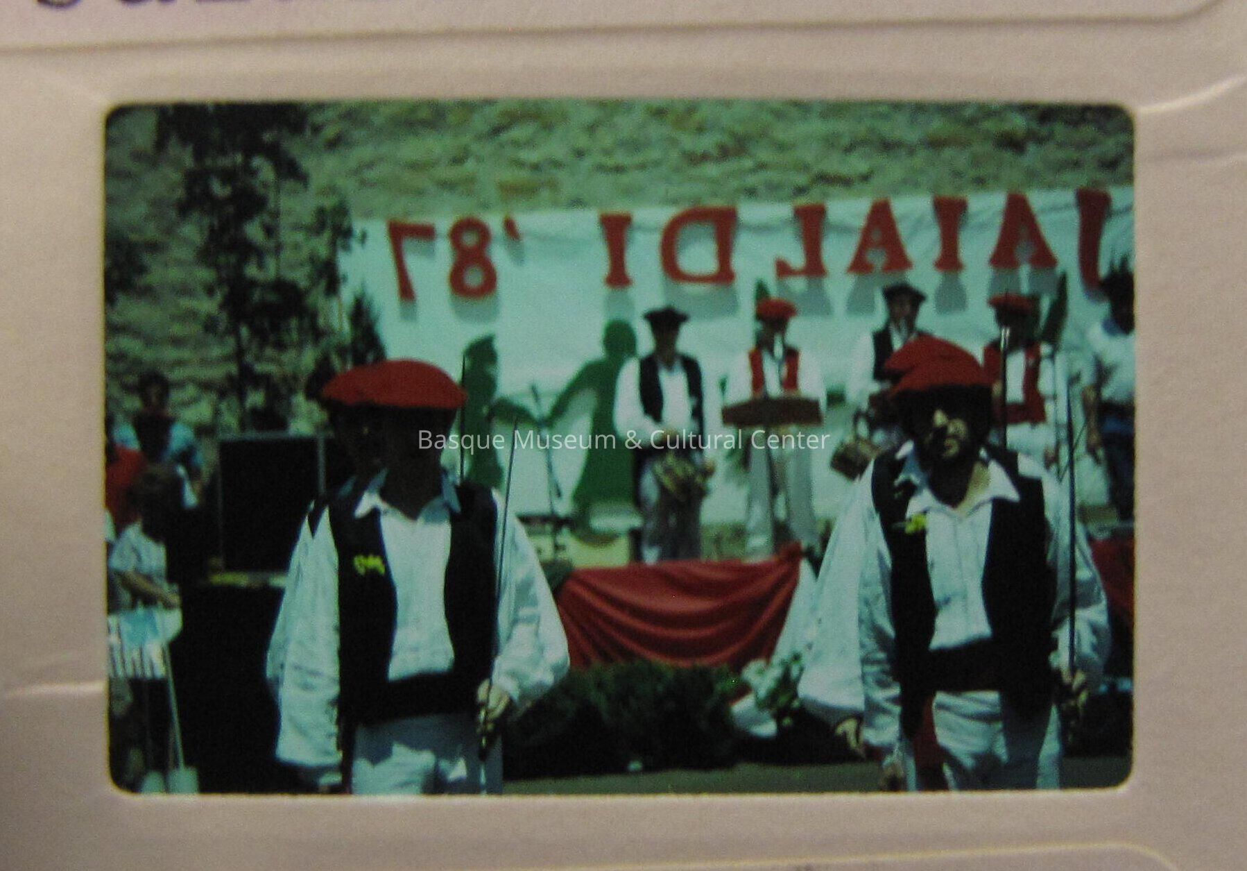 Slide transparency picture of male Basque Dancers at Jaialdi 1987; men are wearing red txapelas, black vests, red or black gerrikos, white long sleeve shirts and pants, and are carrying swords; stage in background with musicians and "Jaialdi 87" sign
