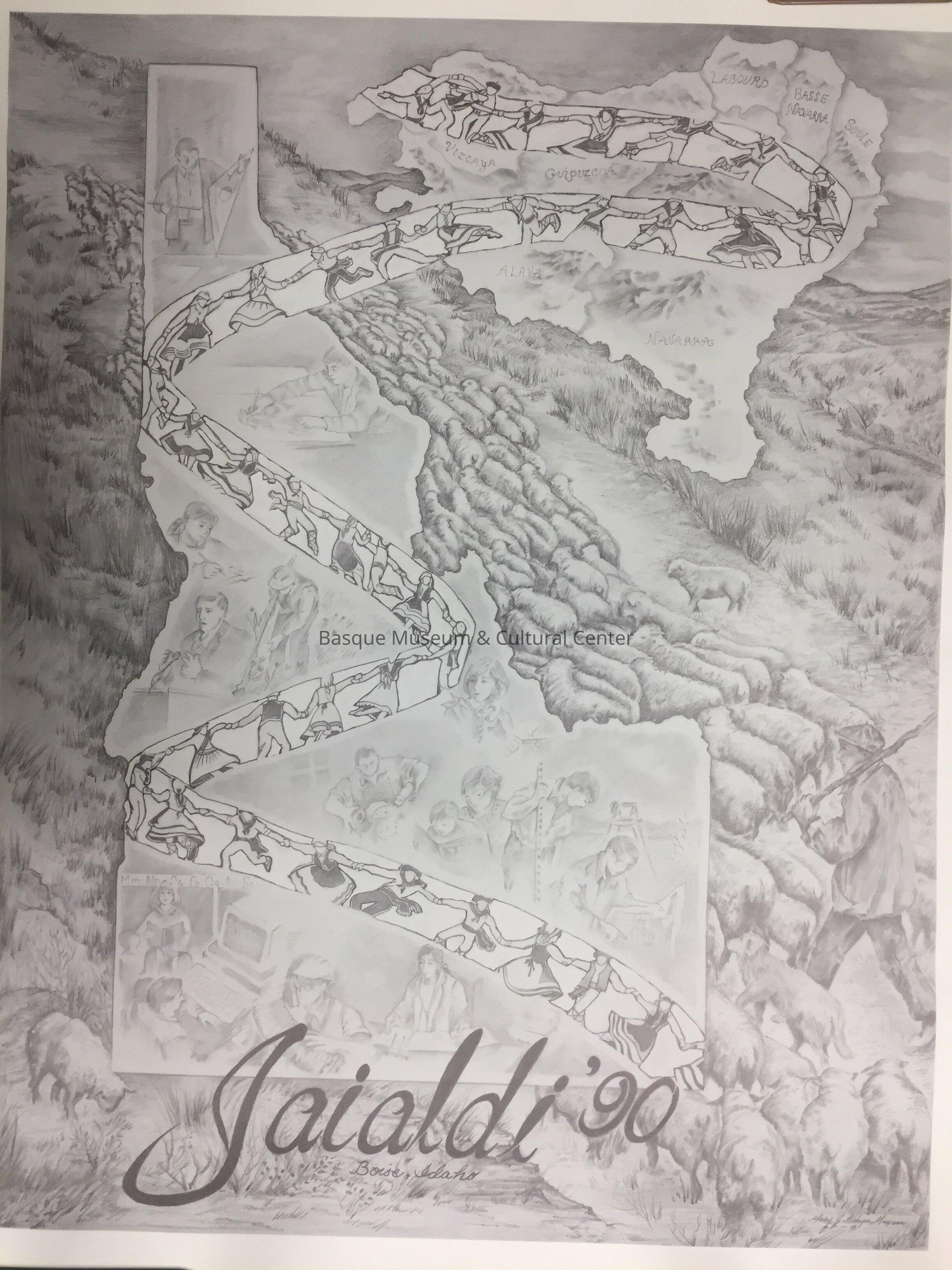 Black and white poster created by Mary J. Aldape-Maxam for Jaialdi '90, featuring the shapes of Idaho and the Basque Country; sheep in the background, and a ribbon of dancers across the two countries.