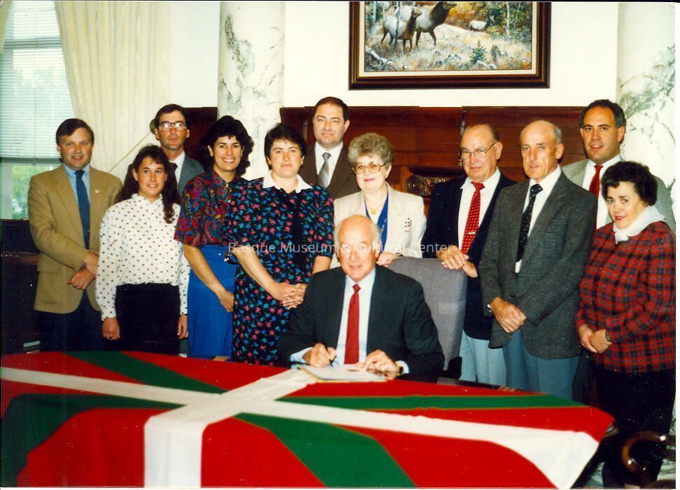 Color photograph of Governor Andrus Signing Proclamation for the Jaialdi ‘90 International Basque Cultural Festival. Back L-R: J. David Navarro, Steve Lejardi , Dave Eiguren, Chris Bieter. Middle L-R: Ana Mendiola, Janice Mainvil, Miren Rementeria Artiach, Gerri Candaux Achurra, Pete T. Cenarrusa, Jim Jausoro, Isabel Larrondo Jausoro. Seated: Governor Cecil D. Andrus.