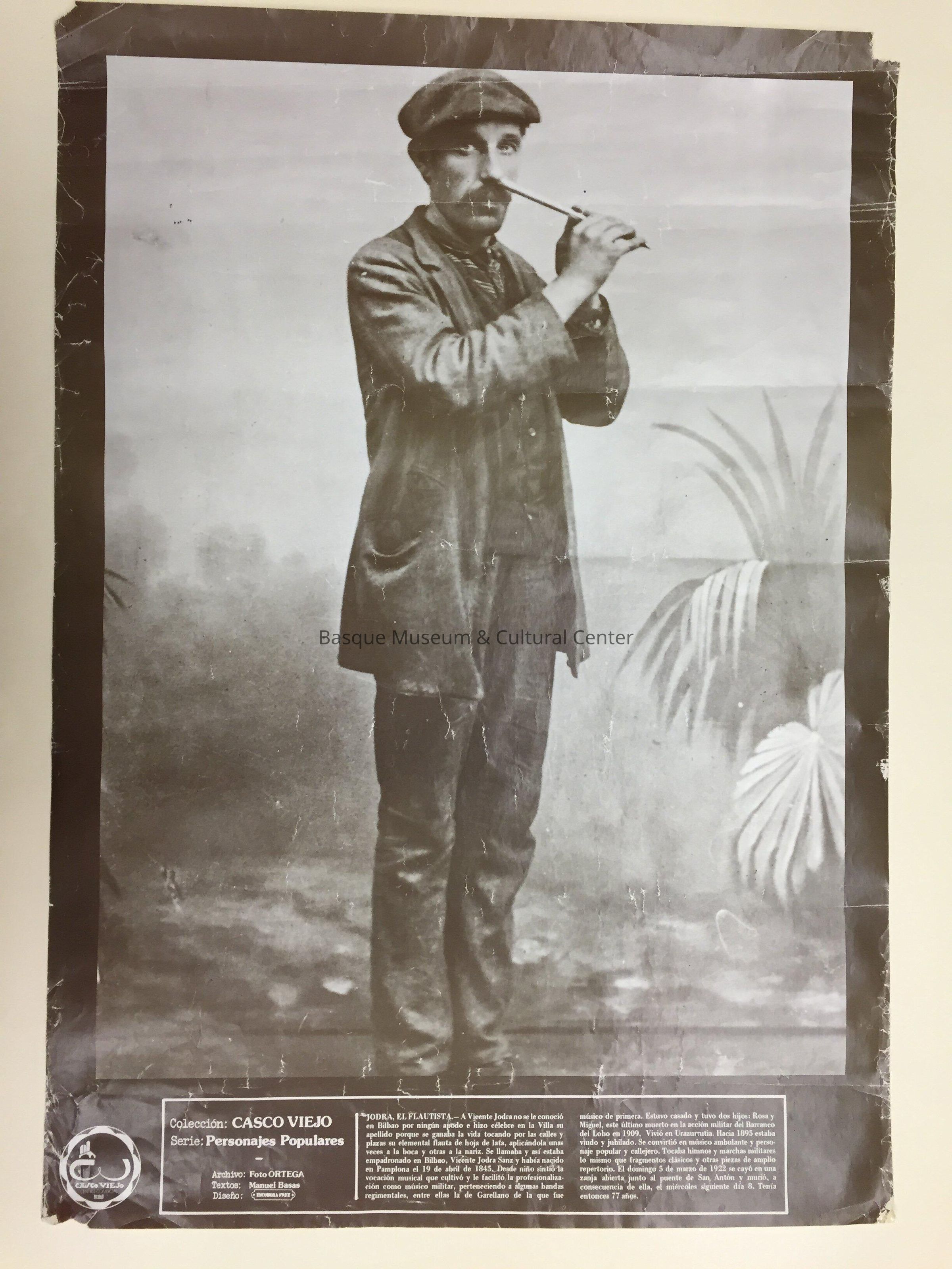 Sepia-tone poster of Bilbao flautist Vicente Jodra. He is holding a flute in his hands and standing in what appears to be a studio setting. Explanatory text box, in Spanish, at bottom of poster.