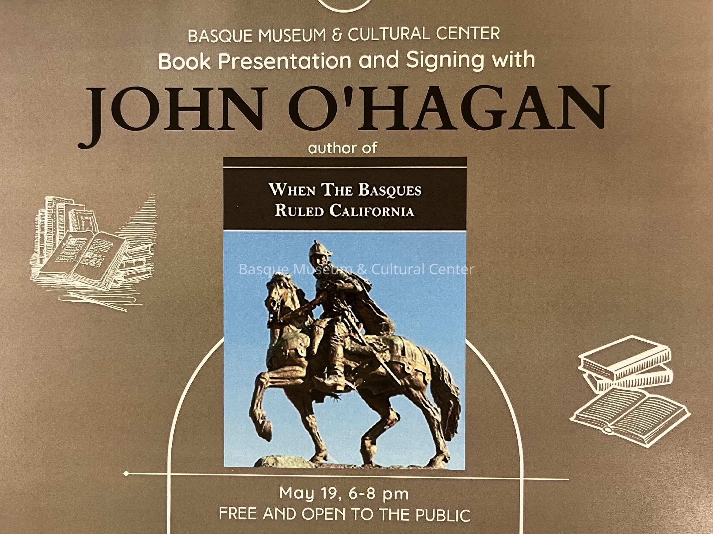 Poster for book presentation and signing with John O'Hagan, author of "When the Basques Ruled California." Includes date, time, location and image of the book cover.