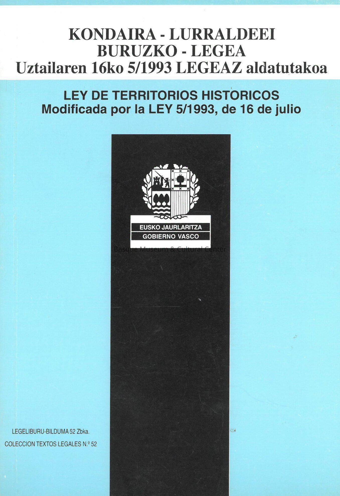 Kondaira lurraldeei buruzko legea, uztailaren 16ko 5/1993, legeaz aldatutakoa = Ley de territorios historicos, modificada por la Ley 5/1993, de 16 de julioEntry/Object ID