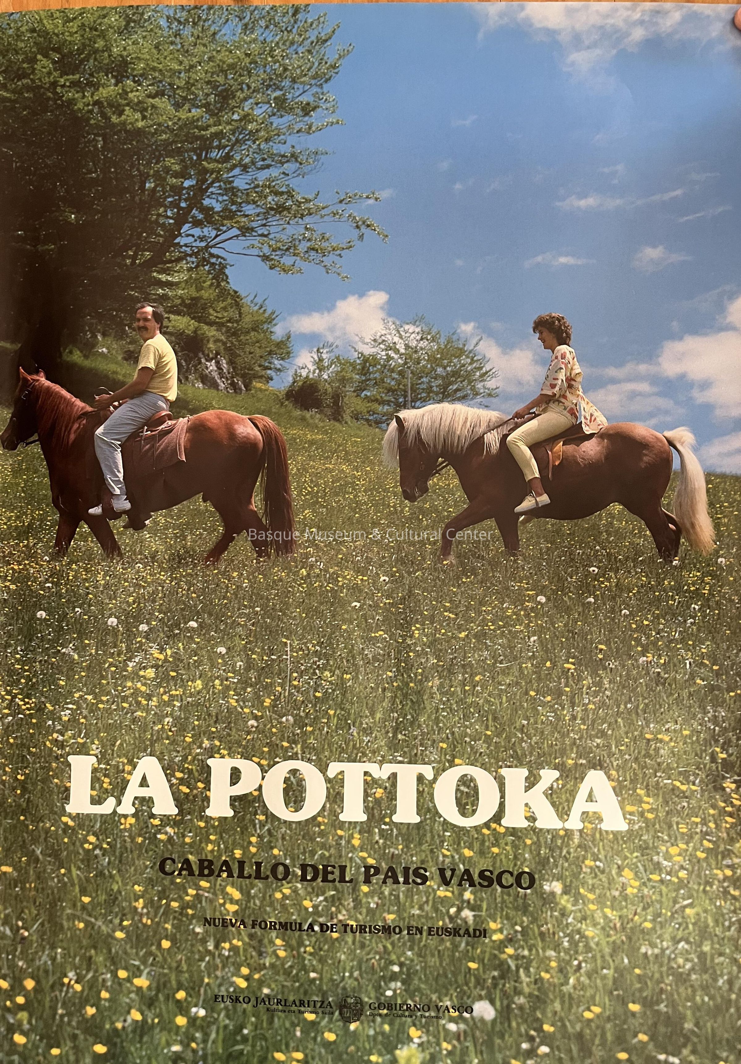 Full-Color Poster depicting two people riding Pottoka horses, a breed of pony native to the Pyrenees Mountains of the Basque Country, to promote tourism to the country