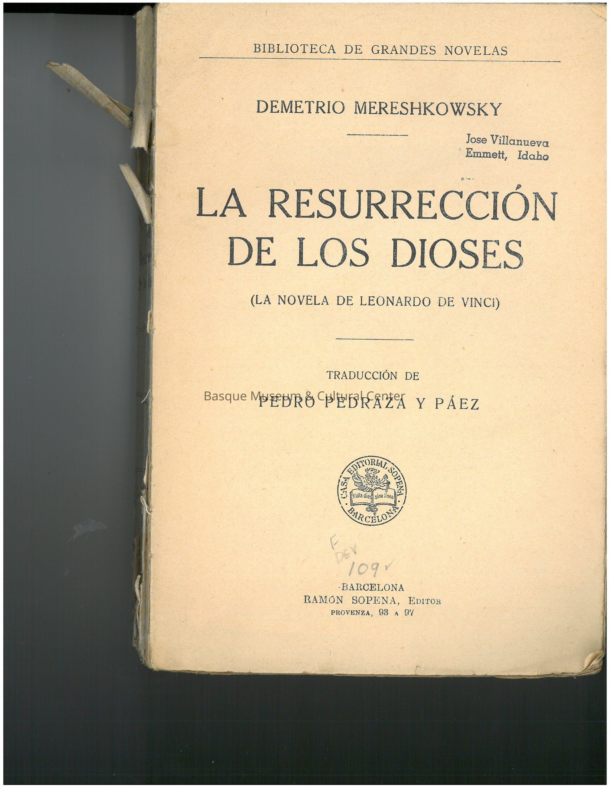 Book - La resurreccion de los dioses : La novela de Leonardo de Vinci by Demetrio Mereshkowsky, published by Ramon Sopena, impresor y editor, Barcelona. Stamped on title page: "Jose Villanueva Emmett, Idaho."