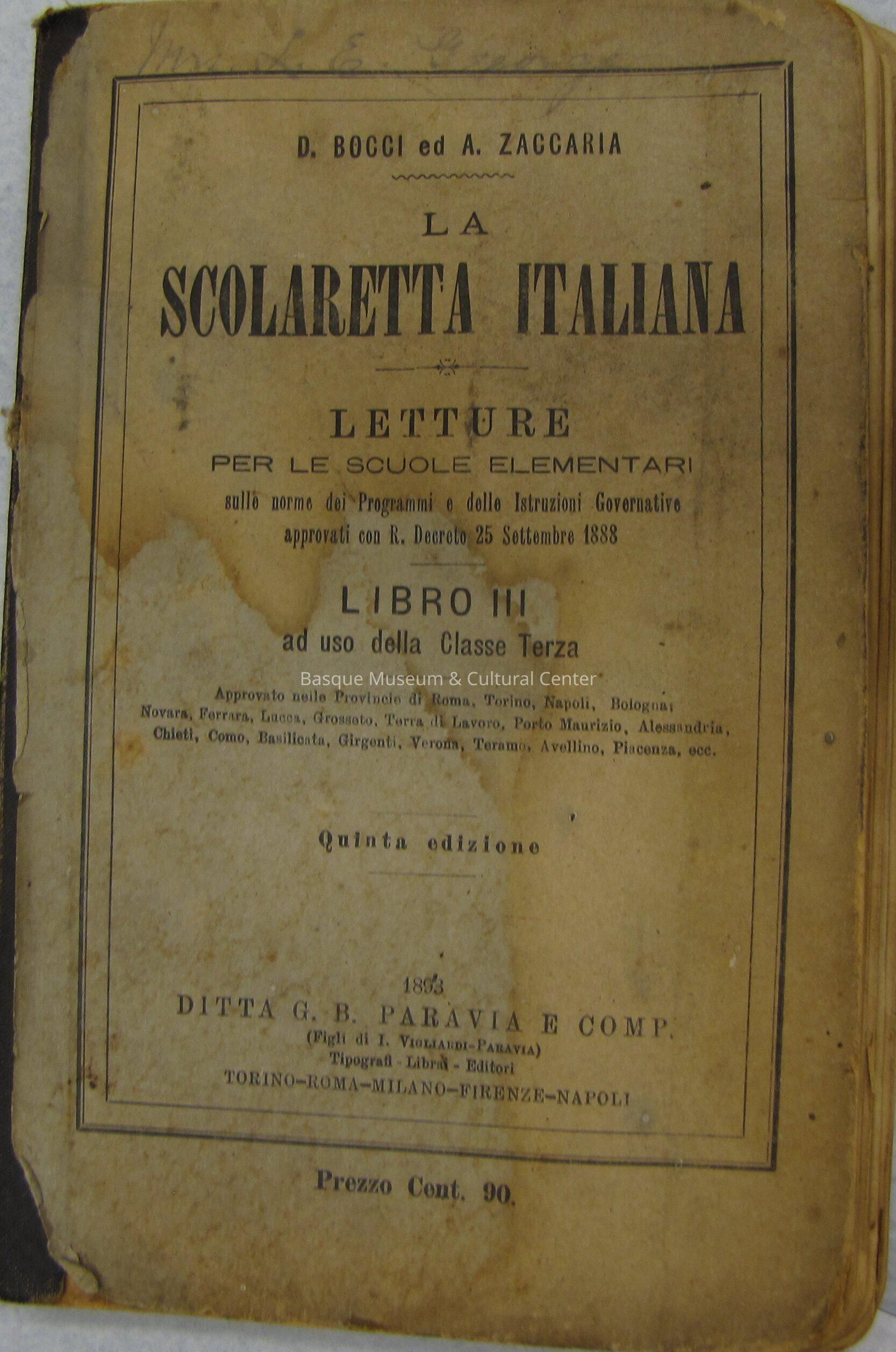 Looks like an Italian Elementary school novel. There are a few names written on the book, on the cover Mrs. L.E. George, on the inside cover Laura E George Jan. 6th 1896 1006 Pacific St. San Francisco Cal. The book is very fragile, most of the pages are almost disconnected from the binding the binding is black and looks like tape that wraps around just the edge. The cover has water damage and the pages are torn on the corners.