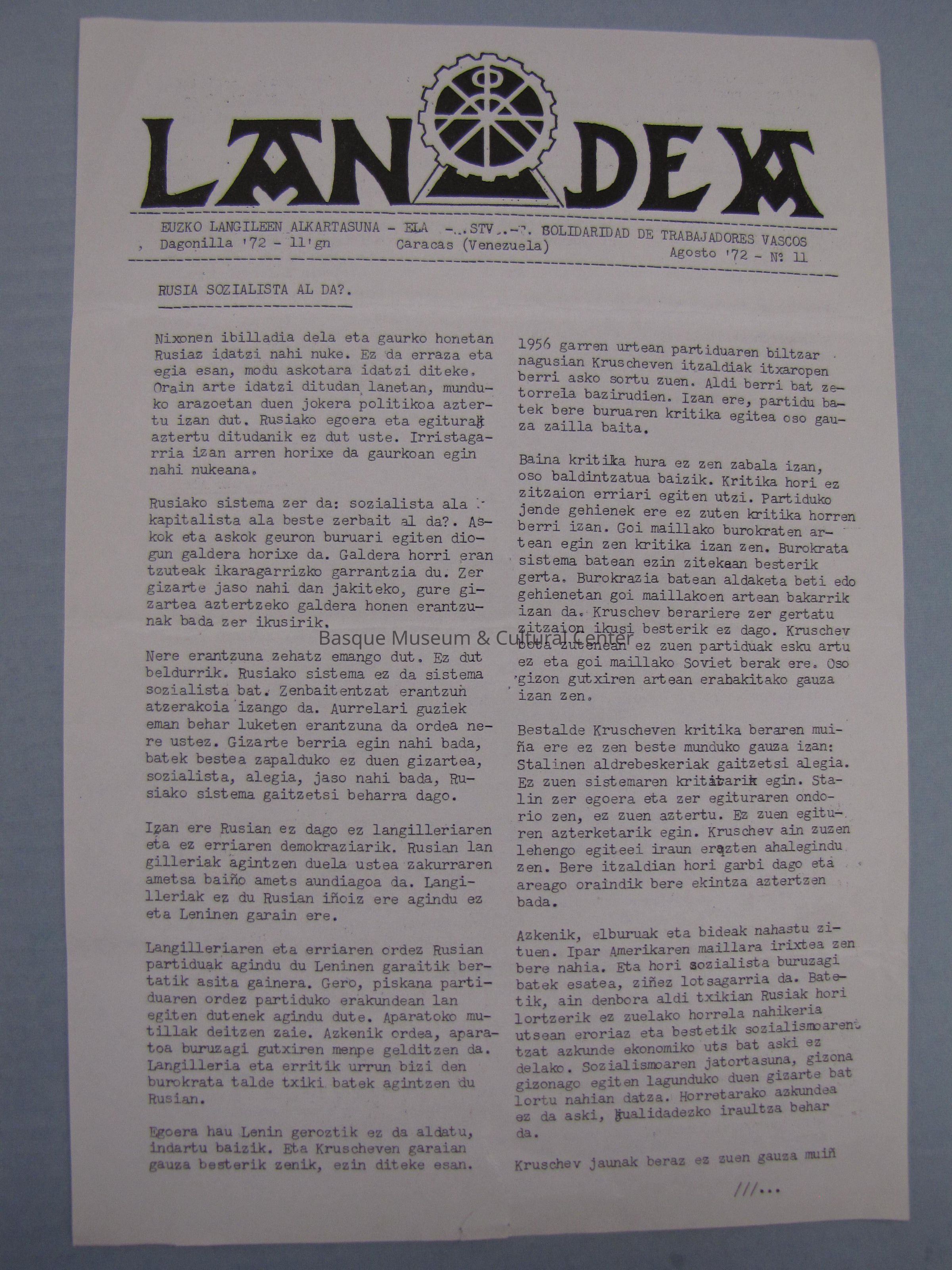 First 2 pages of Lan Deya newsletter; printed in Basque; First page has an article about Russian Socialism; Second page has five quotes from different people with "Some Reasons."