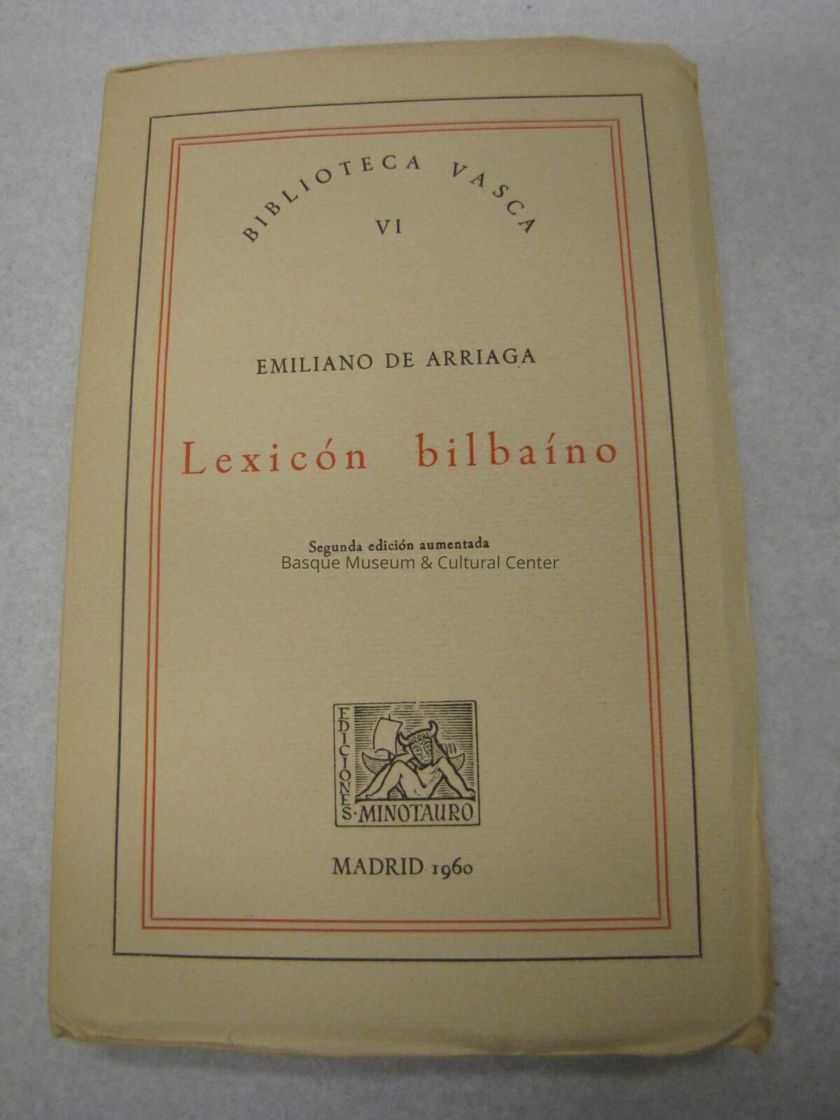 Off-White book with a black and red border. "Biblioteca Vasca" is curved at the top. Bottom has a logo of the publisher. Pages are thick, brown, and connected at the tops.