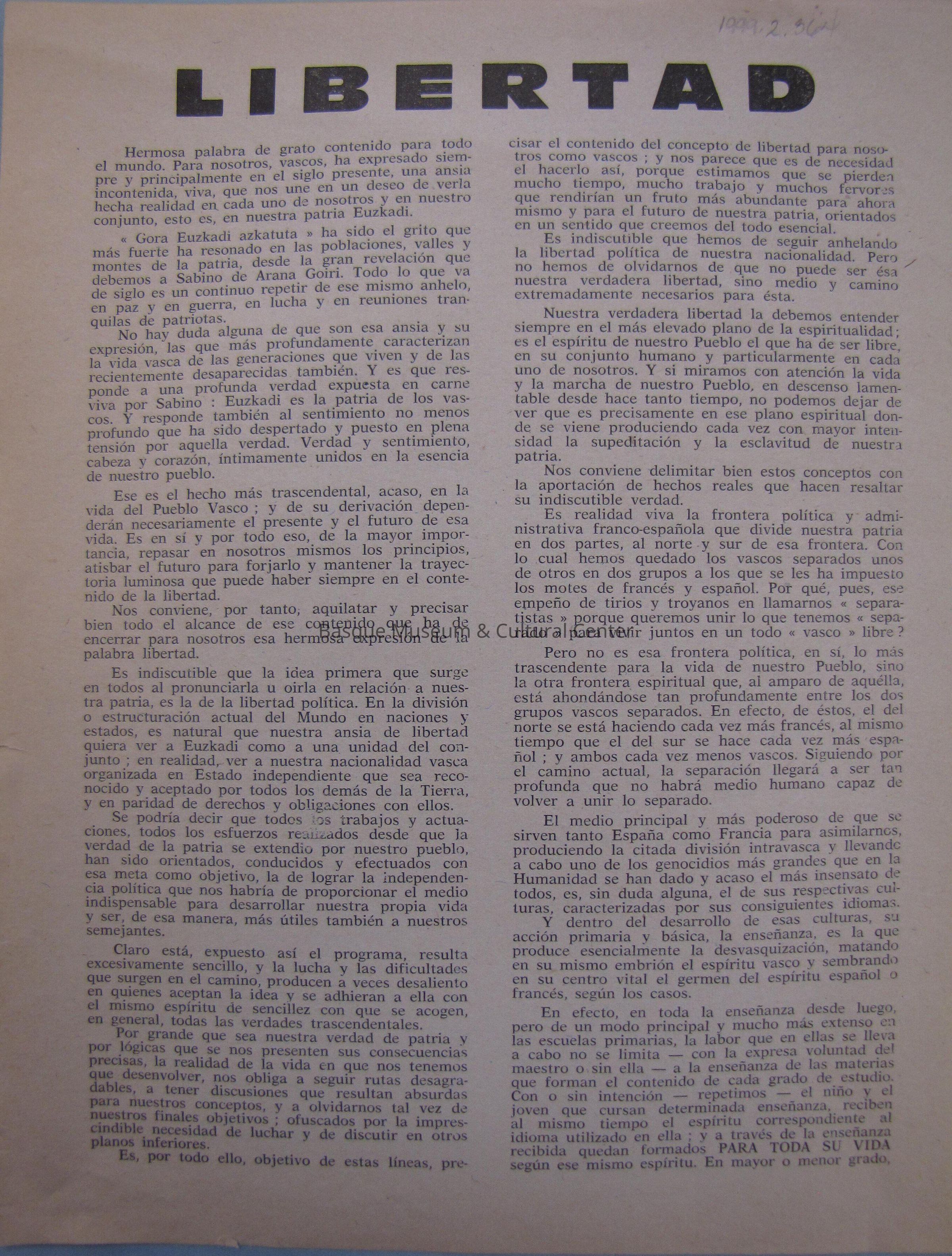 One page, double sided; an opinion essay citing reasons why the Basque public should fight against Franco and his laws; authored by "A.U."