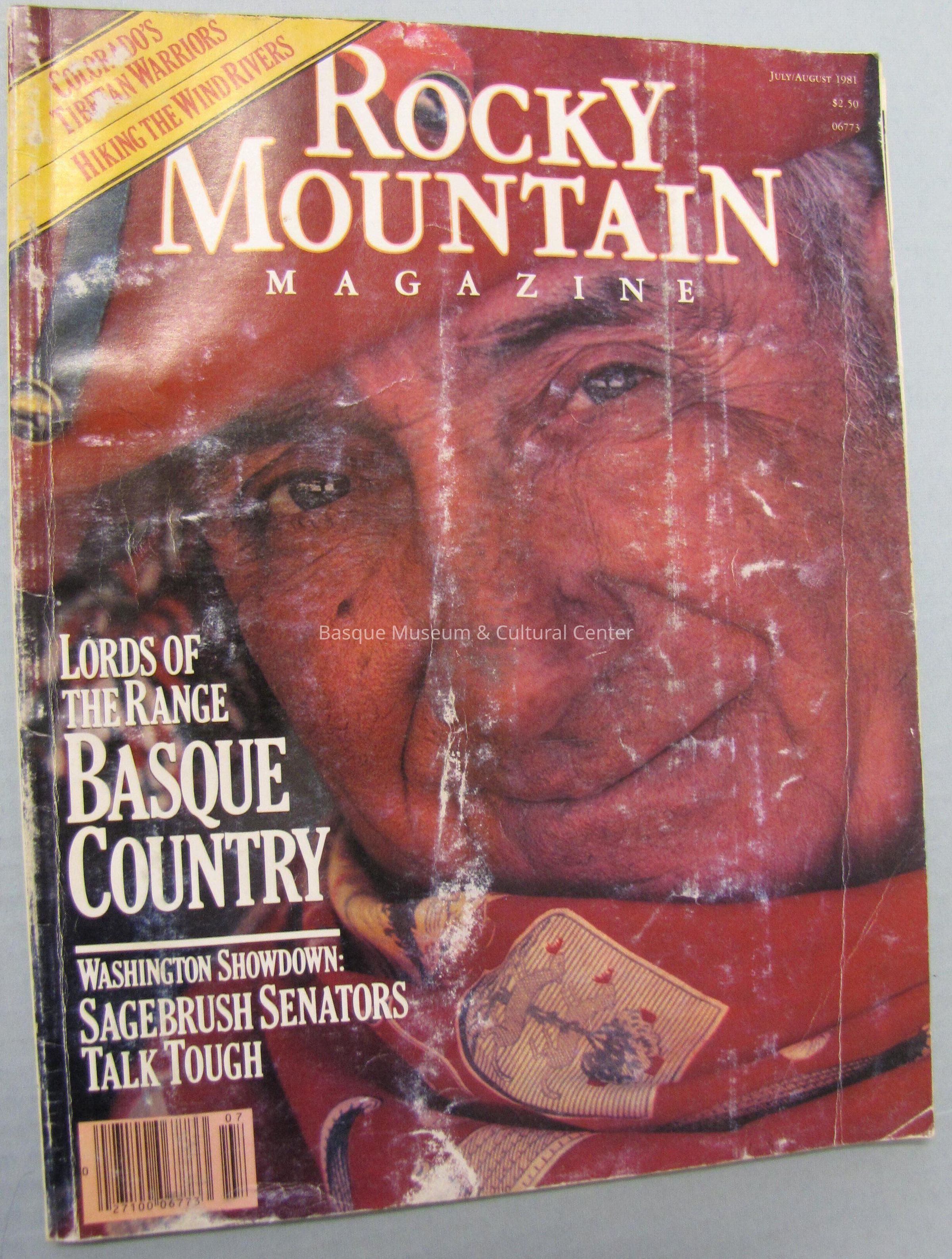 Rocky Mountain Magazine; printed in July/August 1981; main article is entitled Lords of the Range: Basque Country; Cover photo is an older Basque man with a red txapela and scarf; article was written by Michele Strutin; "More than a century ago the first Basques left the Pyrenees to herd sheep in the Rockies. Today these proud people struggle to maintain their identity in their adopted country. Photographs by Sue Bennett and John Running";