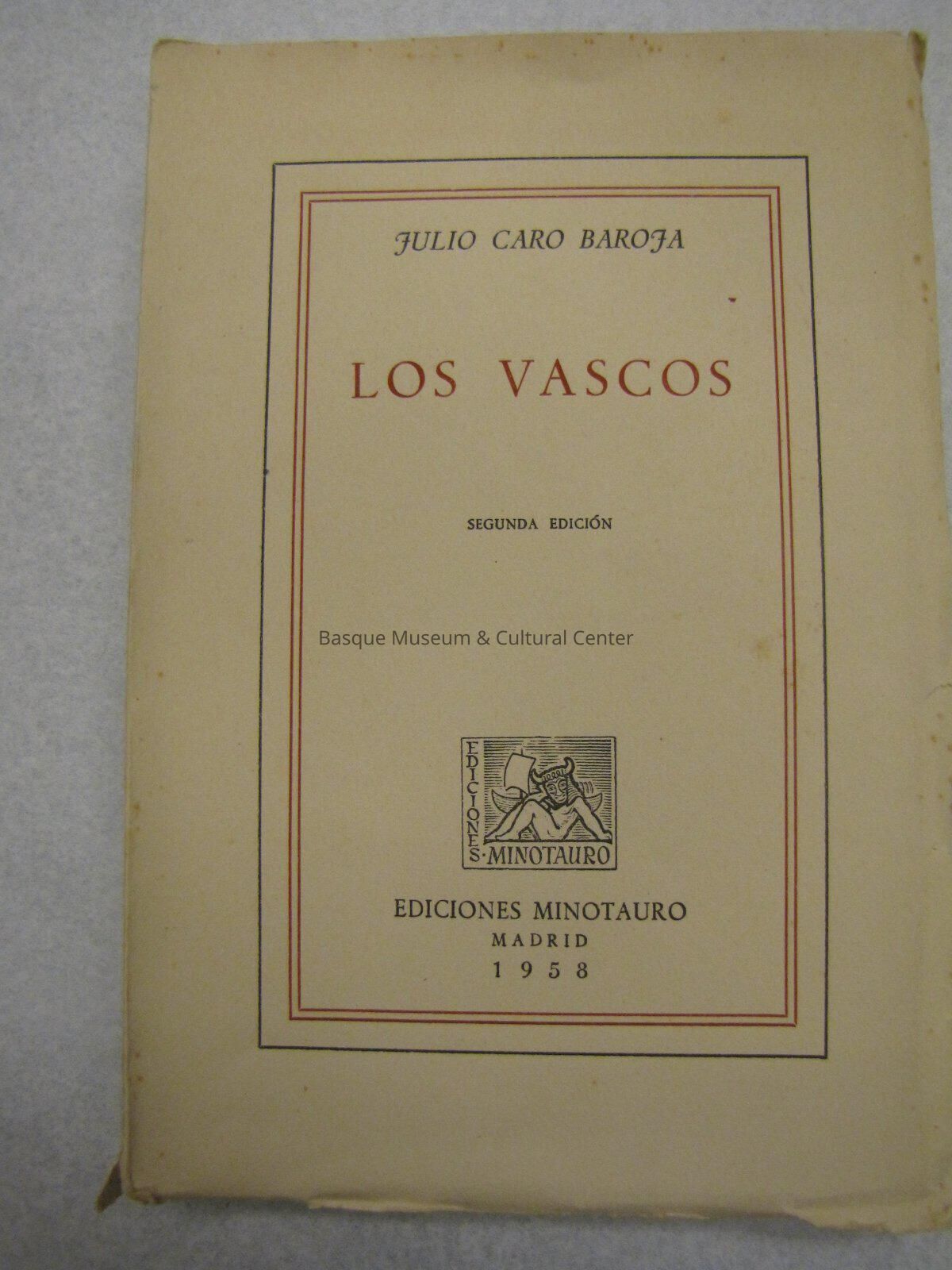 Bordered by black and red lines. Off-white book. Title in red ink. Logo of publisher on front. Pages are thick, rough edged, and connected/folded along top edges. 537 pgs. Book about the Basques.