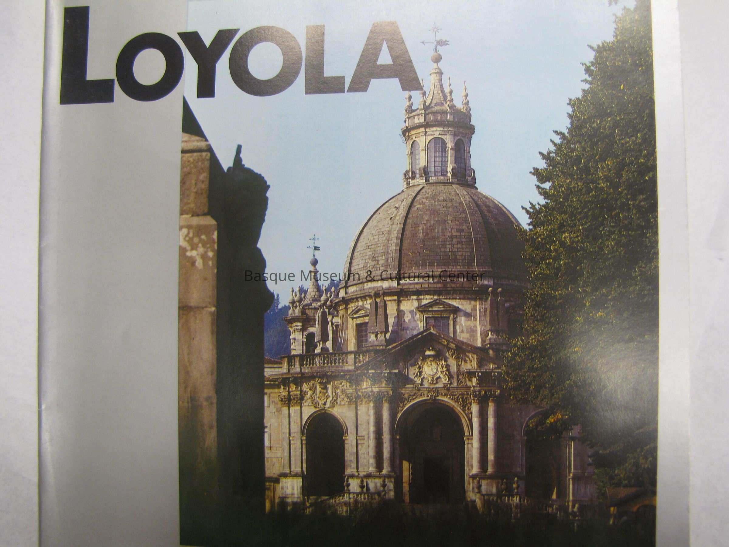 Informational Booklet about Loyola in English. Cover is a picture of the cathedral dome with part of a tree in the foreground. Title is in large text in the upper left corner.
