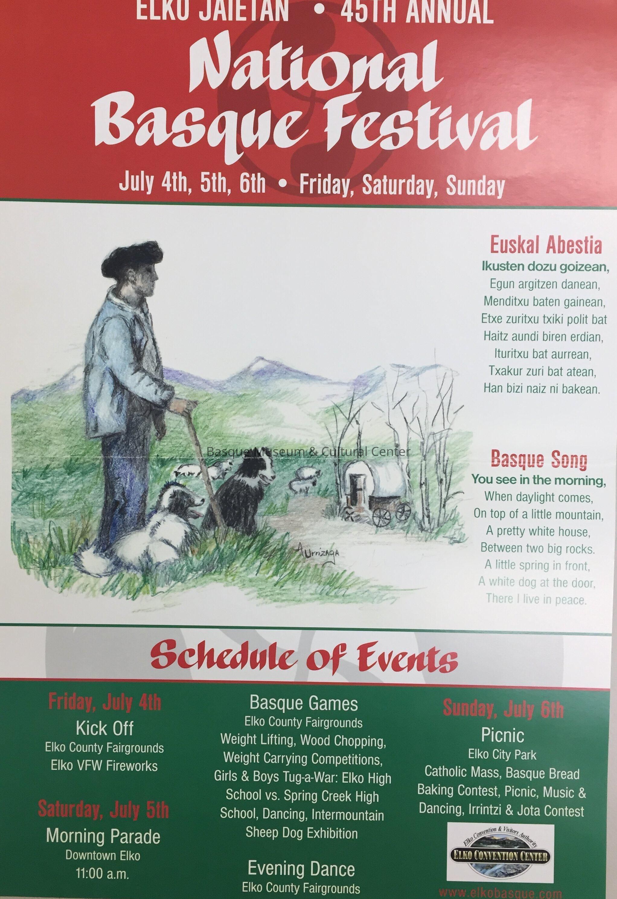 Full-color poster for the 45th National Basque Festival, held July 4-6, 2008, in Elko, Nevada. Includes a drawing of a sheepherder with two dogs, and sheep and sheep wagon in the background; schedule of events.