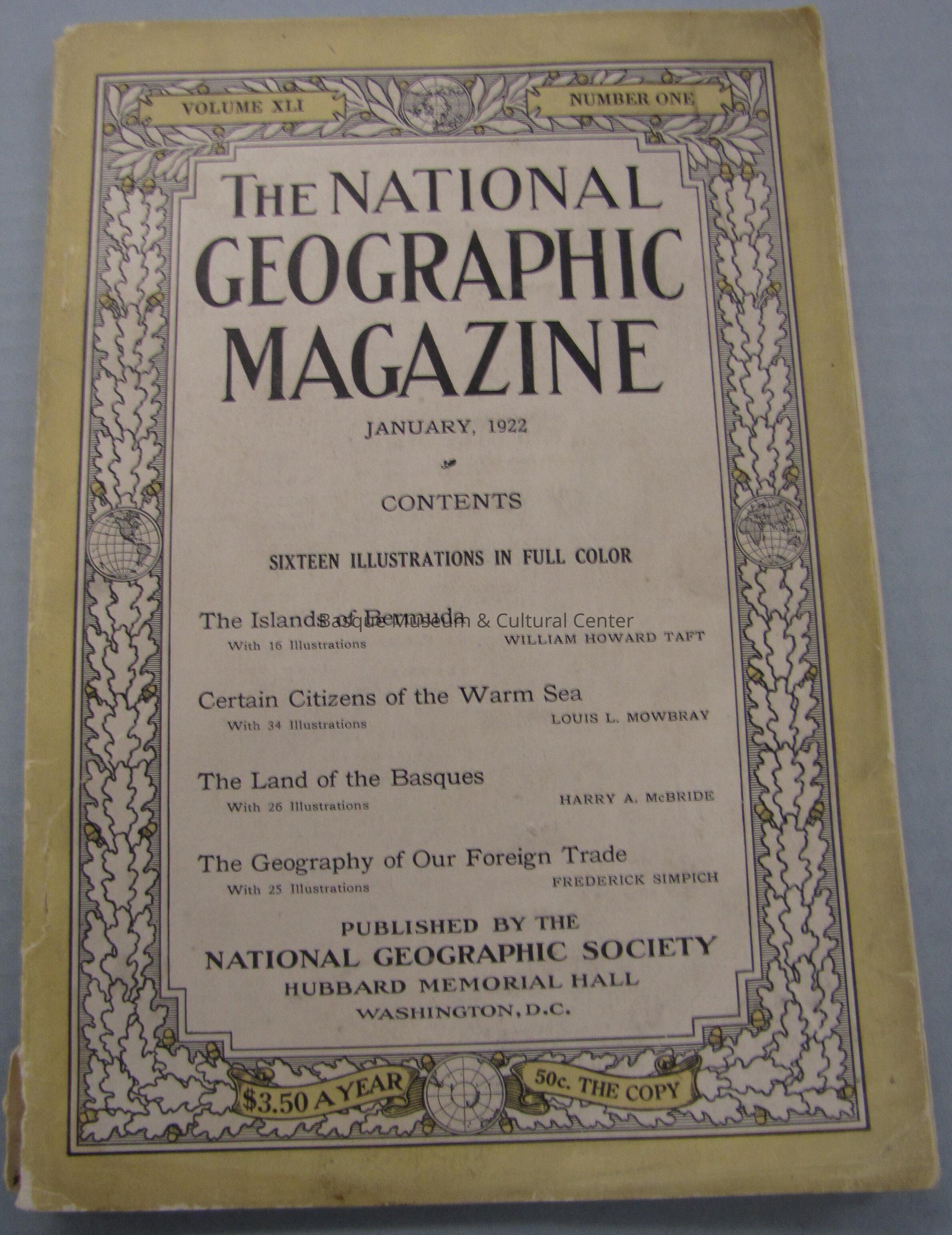 The National Geographic Magazine from January 1922; Volume XLI, Number One; featuring article The Land of the Basques by Harry A. McBride; "Home of a Thrifty, Pictresque People, Who Take Prid in the Sobriquet, 'The Yankees of Spain' "; includes pictures of people and places in the Basque Country; information about tourism, travel, the cities, specifically Bilbao, and other cultural history about the country