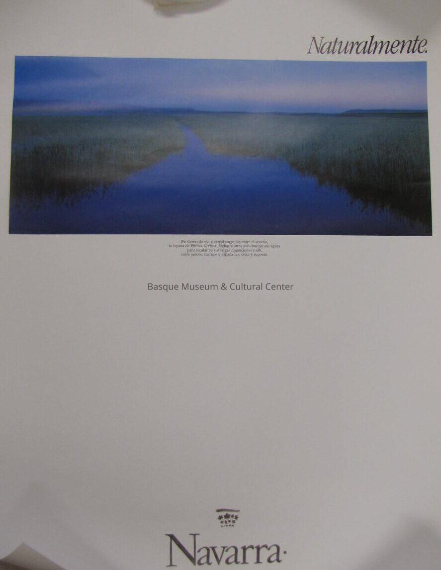 Navarra poster; "Naturalmente" heading across the top, right justified; Image of blue water and stream, tall green grasses, distant mountains, blue sky with a pink cloud; Spanish text says "En tierras de vid y cereal surge, de entre el secano, la laguna de Pitillas. Garzas, fochas, y otras aves buscan sus aguas para recalar en sus largas migraciones y alli, entre juncos, carrizos y espadanas, crian y reposan."; White background.