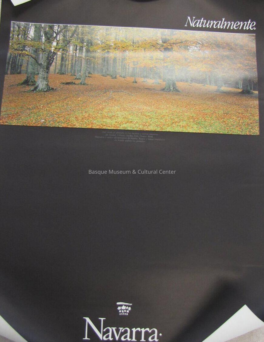 Navarra poster; "Naturalmente" heading across the top, right justified; Image of trees in fall, orange and yellow leaves on the trees and on the ground, forest, white/grey colored bark, green grass; Spanish text says "Del verde al purpura el los montes y sierras navarras de Aralar, Urbasa, Andia, Irati, Quinto Real...Hayedos y suelos alfombrados de nierba. Rasos y lomas onduladas en donde pastan los ganados."; Black background.