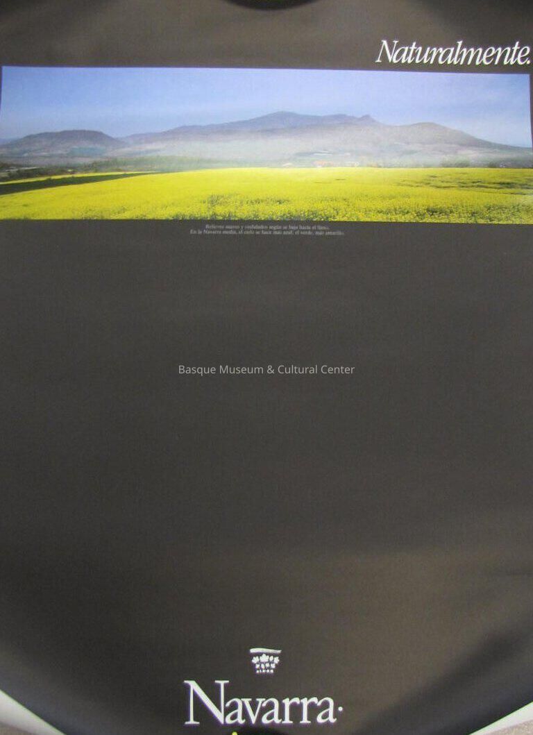 Navarra poster; "Naturalmente." heading across the top, right justified; Image of yellow field, flowers or grain, blue sky, mountains in distance, a few houses/buildings; Spanish text says "Relieves suaves y ondulados segun se baja hacia el llano. En la Navarra media, el cielo se hace mas azul; el verde, mas amarillo."; Black background.