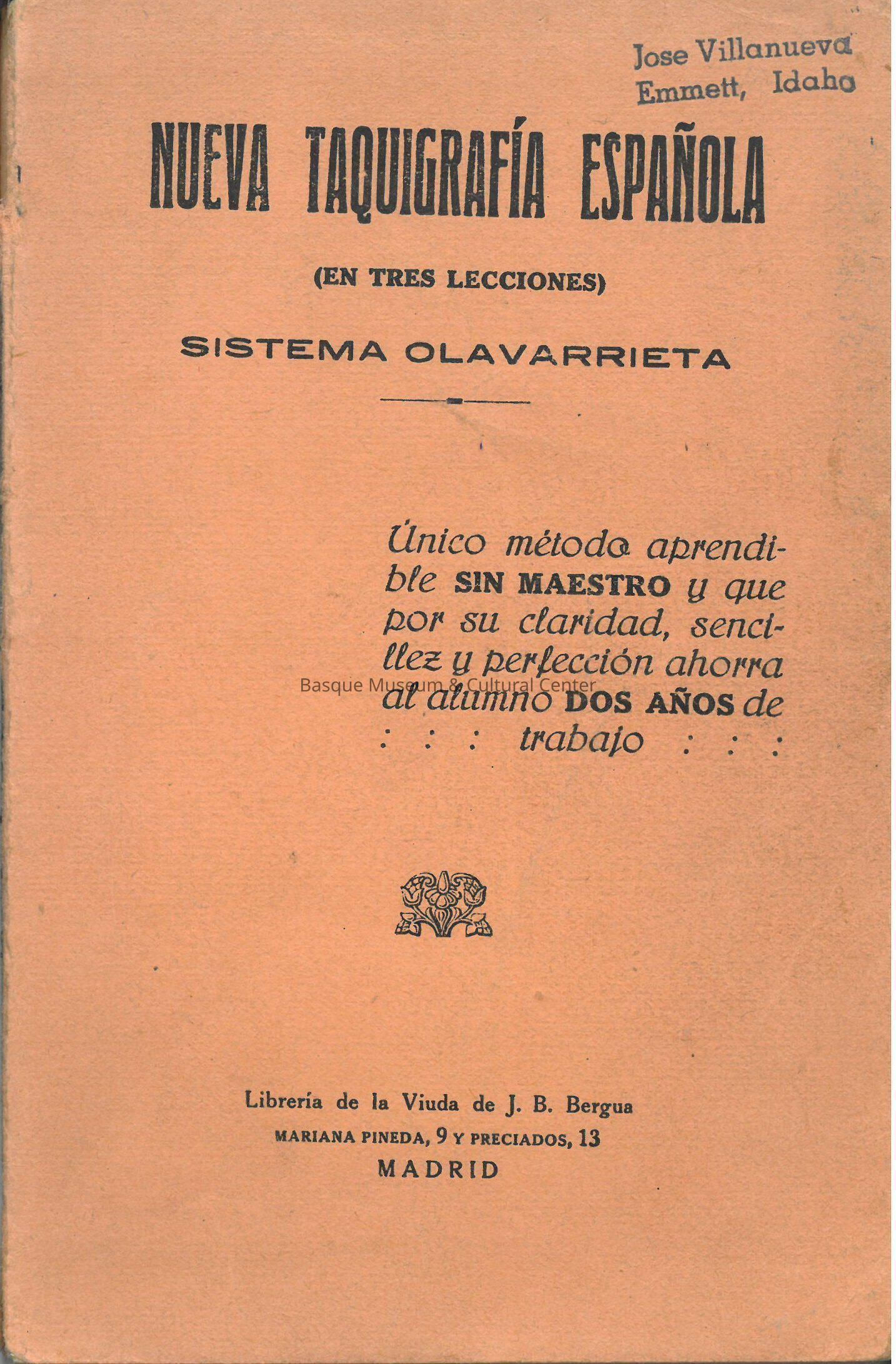 Nueva taquigrafia espanola : sistema Olavarrieta : unico metodo aprendible sin maestro y que por su claridad, sencillez y perfeccion ahorra al alumno dos anos de trabajo.Entry/Object ID