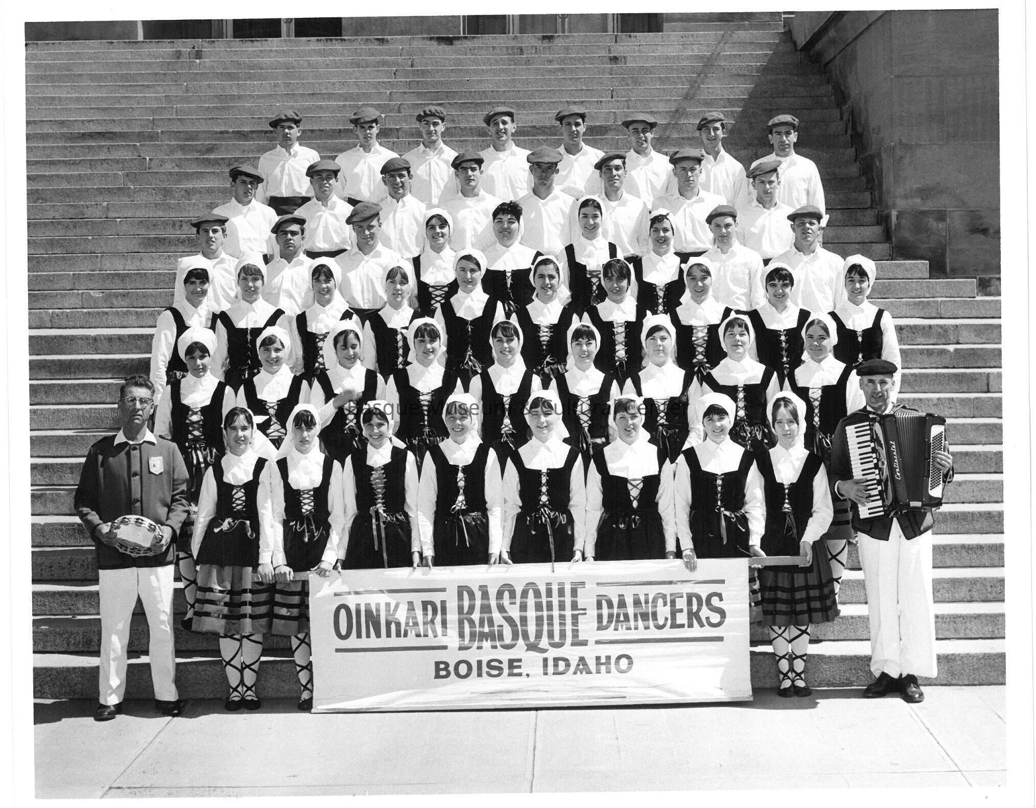 Copy of a black and white photo print, of Boise, Idaho Oinkari dancers in costume. There are 31 women, and 23 men. Fifty four people in total. Appears to have been taken on the steps of the Idaho Statehouse in Boise.
