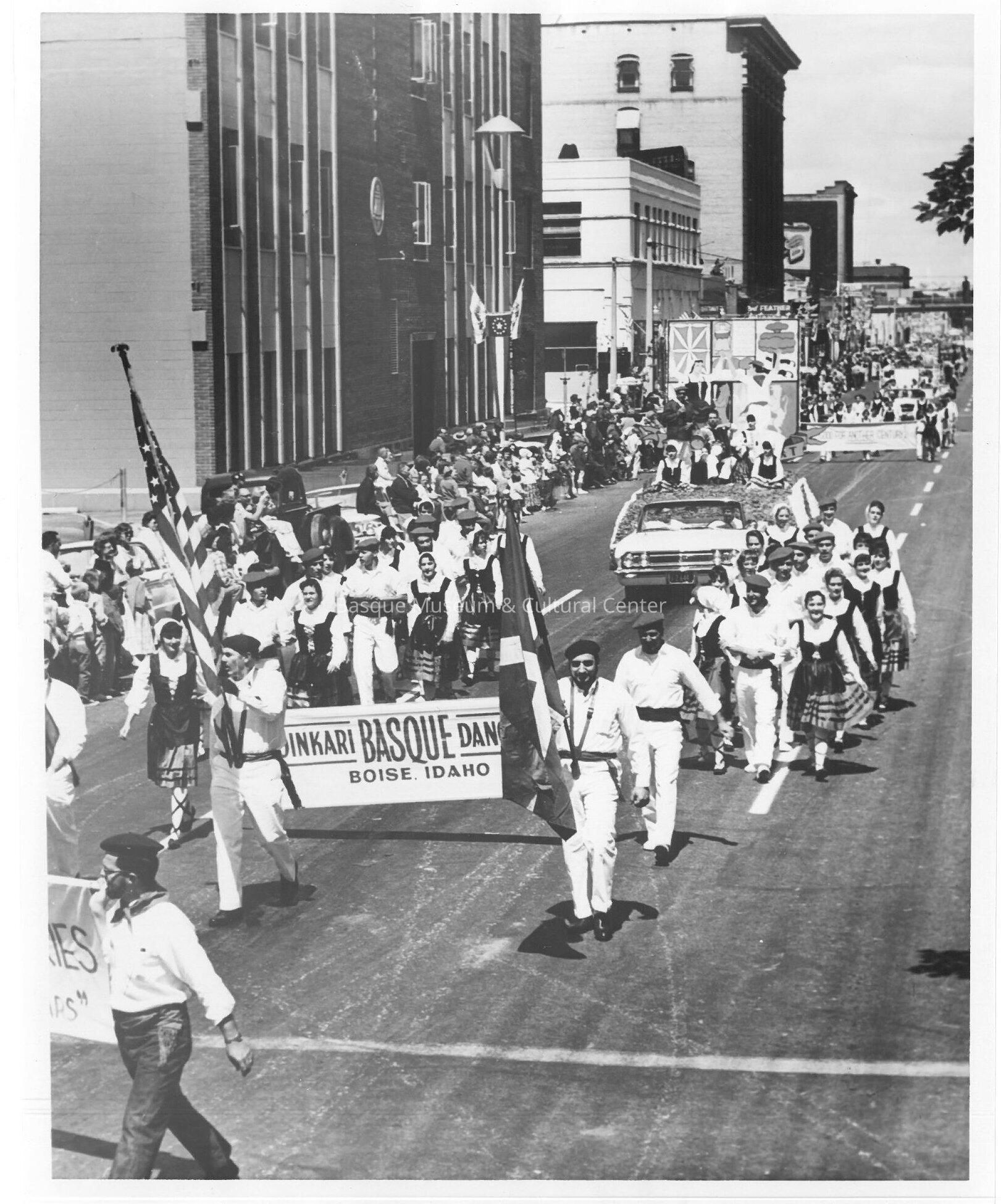 Copy of a black and white photo print. There are Oinkari dancers in costume in two lines, parading in middle of street. One man on left holds the American flag, while another on right holds the Basque flag. Both men are at front of line. Another man in front of flagholders is holding a banner.
