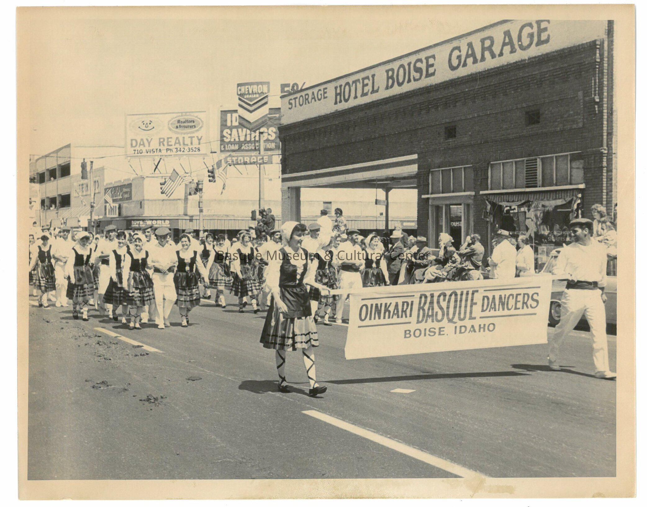 Copy of a black and white photo print. There are Oinkari dancers of Boise, Idaho in costume, parading in a festival/parade in the middle of the street, adjacent to the Hotel Boise Garage, on the right hand side of street. There are spectators on right side of street.