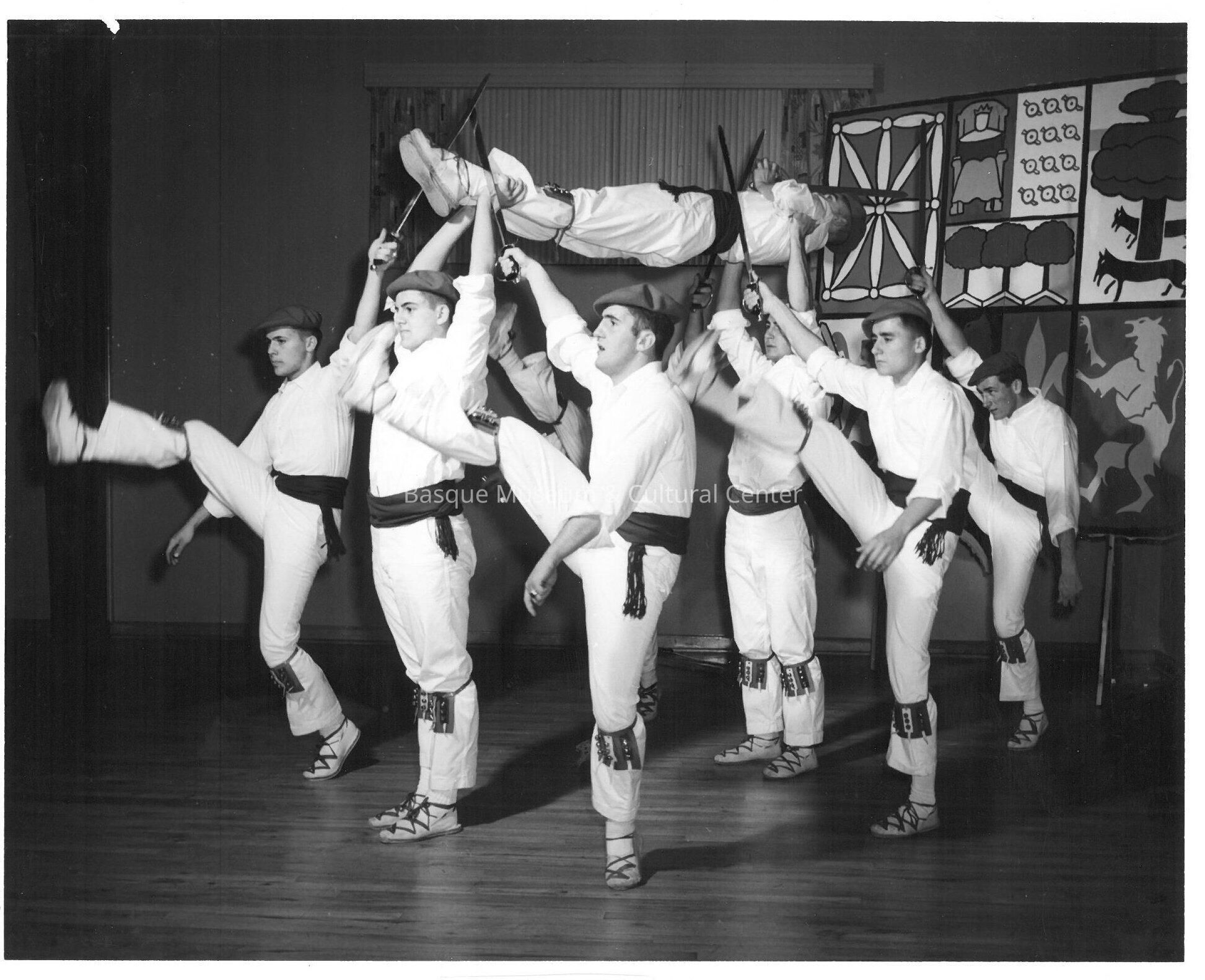 Copy of a black and white photo print, of Oinkari dancers. There are 8 men in costume dancing/performing. Seven men are holding up one man tied up. Two men, one in front and one in back are holding man in air with both hands, while 5 men hold man in air with one hand holding swords that are attached to lifted mans bindings, while kicking right leg up in the air.
