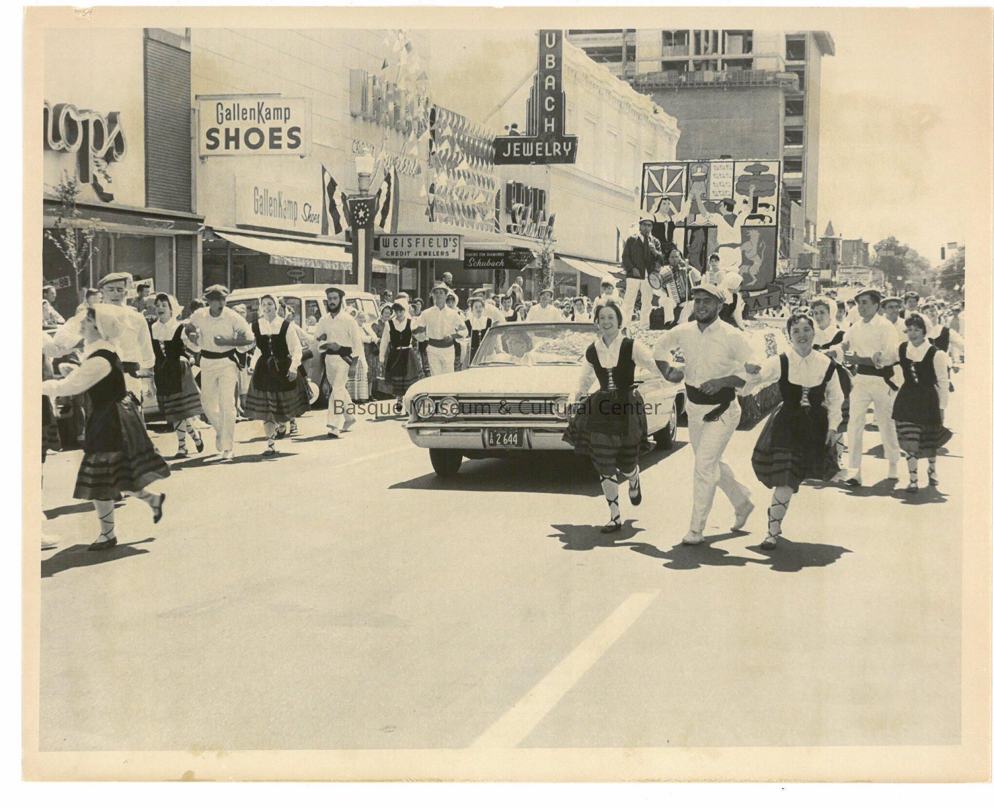 Copy of a black and white photo print. There are Oinkari dancers in costume in 2 lines parading/dancing in the middle of street. In each line is a man in the middle and 2 women on each side of him together holding hands. There are spectators on left hand side of street, and a business named GallenKamp shoes.