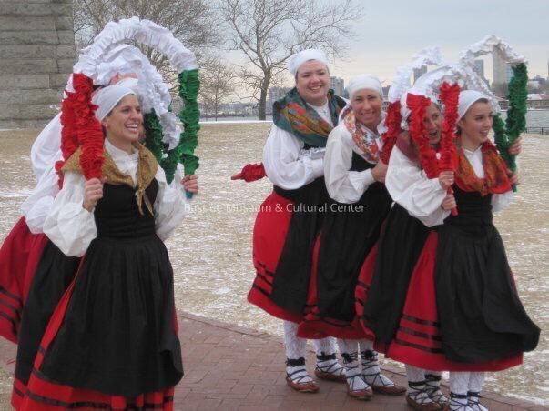 Digital scan of a color photoprint: Oinkari Basque Dancers, in dance costume, at Ellis Island for opening of "Hidden in Plain Sight: The Basques" exhibit On left: - Izar Bicandi and unidentified. On right, front to back Miren Aizpitarte; Jill Aldape; Itxaso Cayero; Alaina Gavica