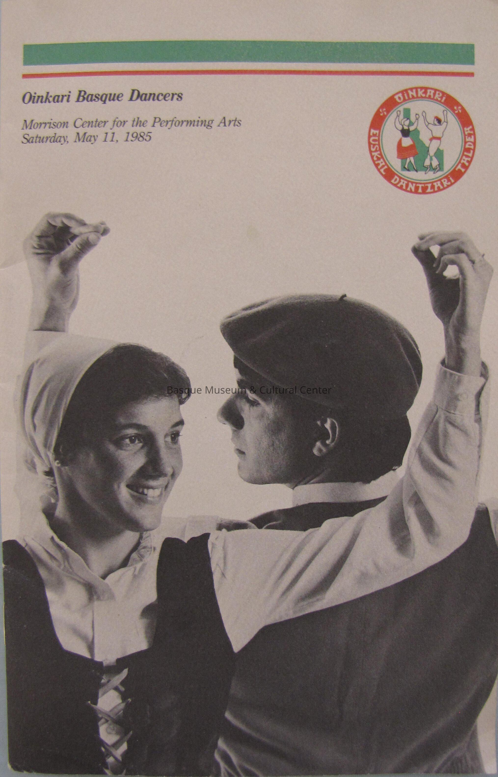 Informational booklet (A) about the Oinkari Dancers and historical background about the Basque country, language, history, and its dances; booklet is gray with a black and white picture of a male and female Basque dancer on the front, inside has text and pictures of Basque dancers; this booklet was created for the performance at the Morrison Center for the Performing Arts on Saturday, May 11, 1985