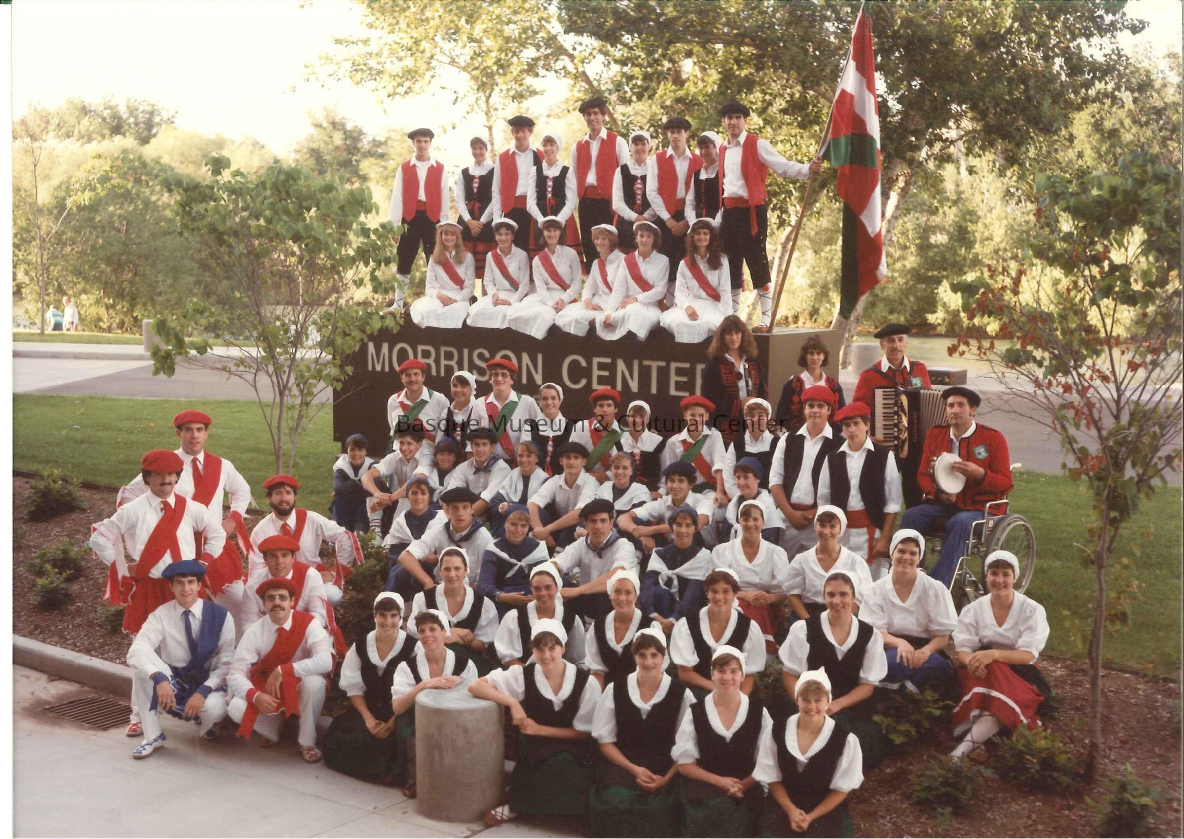 Group photo of the Oinkaris around the Morrison Center sign. Aitor Amuchestegui holds the Basque flag, Onati dancers are below on the left side. Musicians are in the back row on the right below the sign.