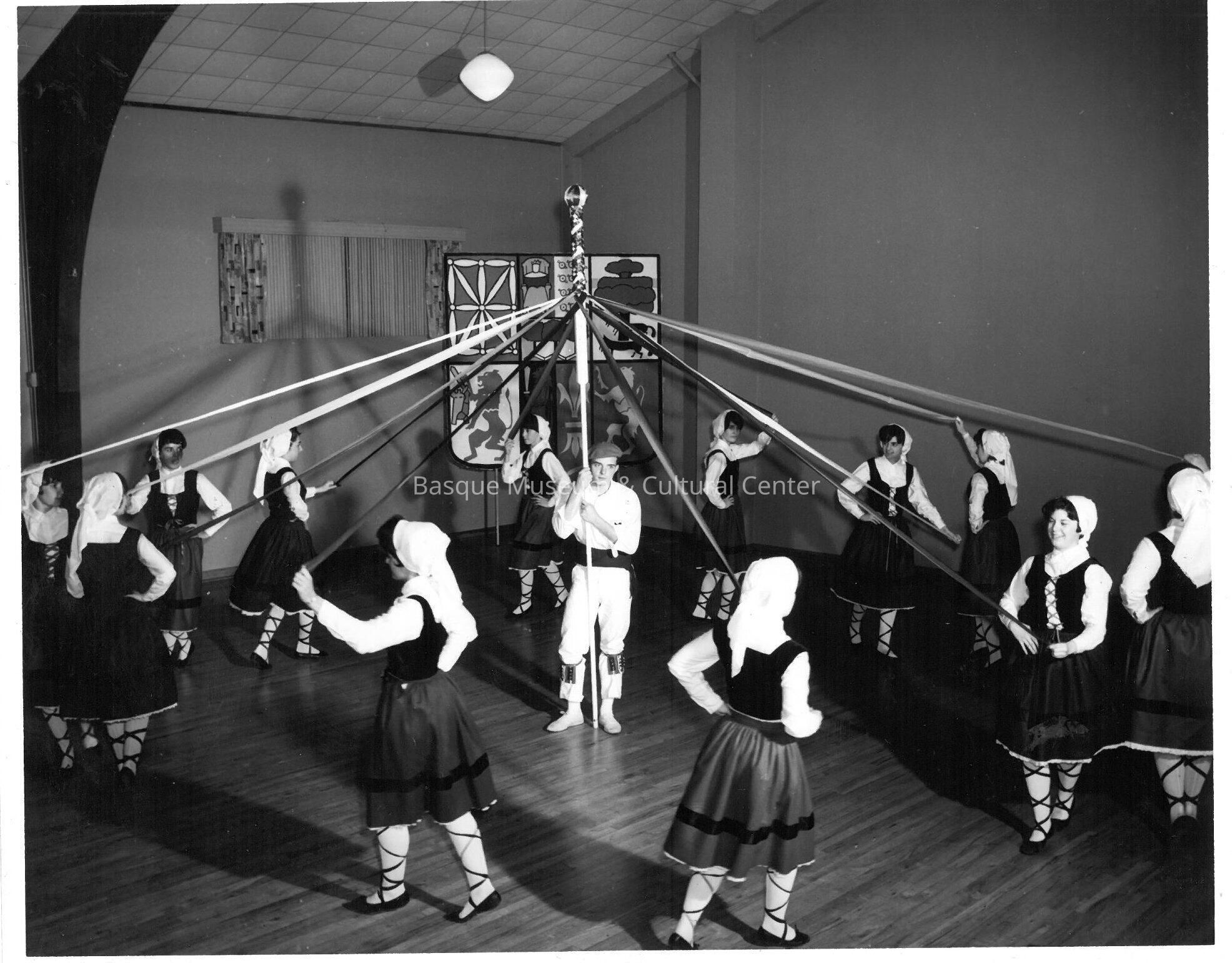 Copy of a black and white photo print, of Oinkari dancers. There is 1 man holding a pole, while 12 women are dancing/performing around him in a circle, holding a long stick attached to the mans pole. There are 13 people in total, all in costume.