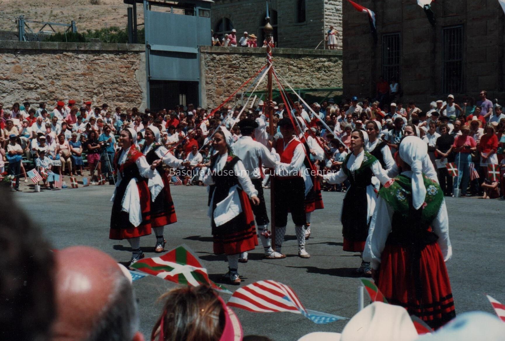 Digital scan of a color photoprint: Oinkari Basque Dancers performing at Jaialdi '87, held at the Old Idaho Penitentiary in Boise, Idaho