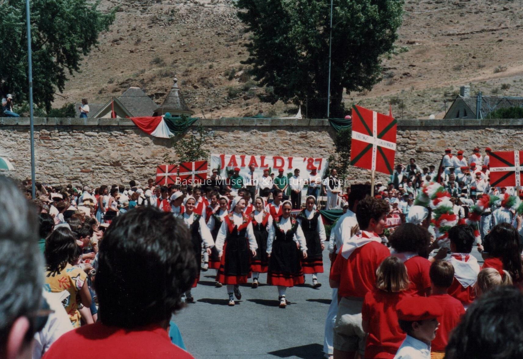 Digital scan of a color photoprint: Oinkari Basque Dancers performing at Jaialdi '87, held at the Old Idaho Penitentiary in Boise, Idaho