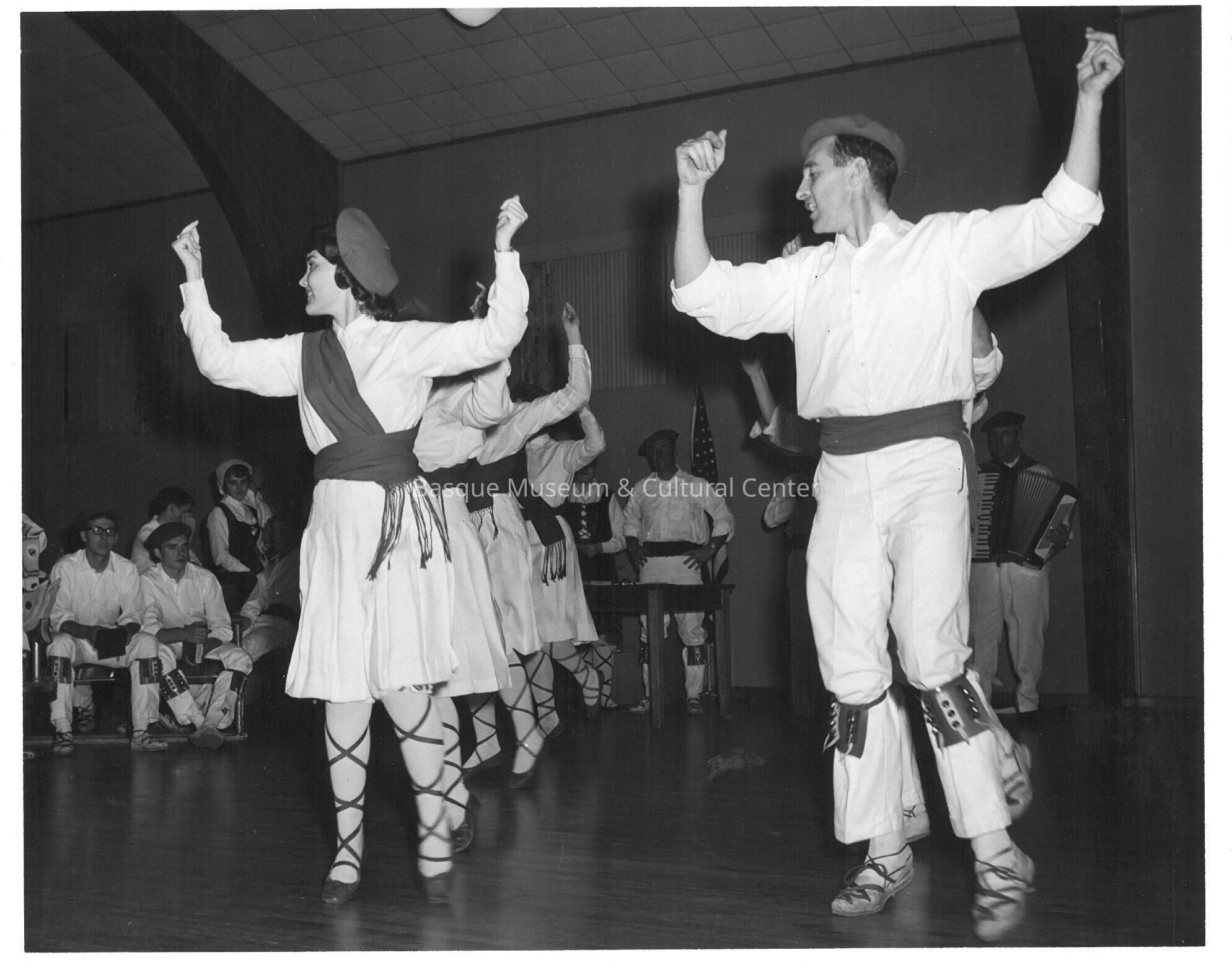 Copy of a black and white photo print, of Oinkari dancers. There are an estimated 9 men, and 6 women in costume. Four women are dancing/performing in line on left, and 2 men are dancing/performing in line on right with hands up. One man is playing accordian, while one man and women are standing at a table behind dancers/performers, with 4 men sitting in chairs watching, and one women standing. Taken at the Basque Center in Boise.