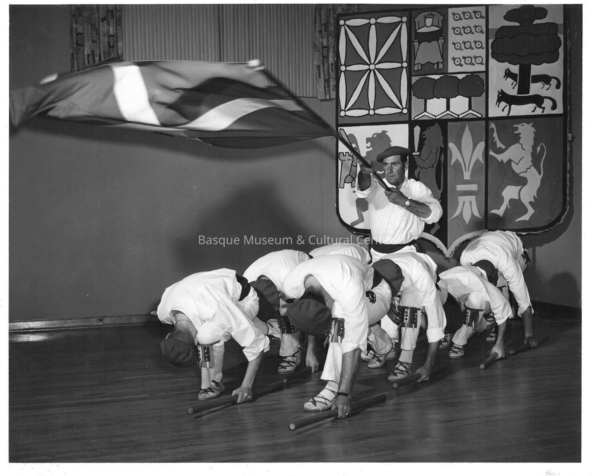 Copy of a black and white photo print, of the Oinkari dancers. There are 9 men dancing/performing in costume. One man - Ray Mansisidor - is in middle holding the Basque flag on a pole, while 4 men are kneeling down with heads bowed on both sides of flag holder with a stick in their left hand. The photo was taken at the Basque Center in Boise.