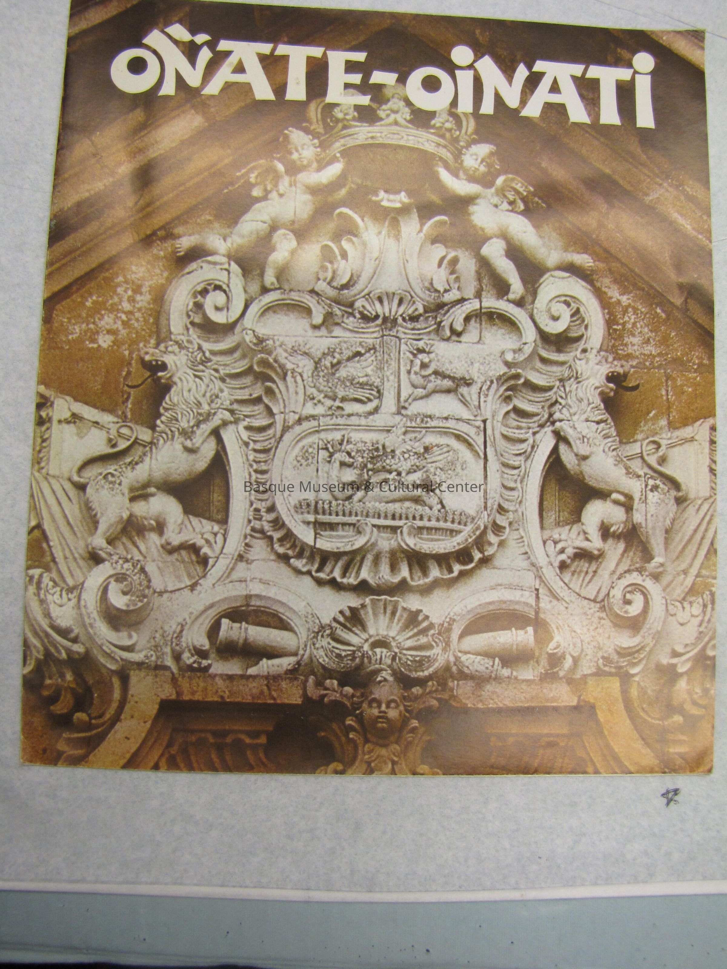 Front has a photo of a molding at the peak of a building of the Onati coat of arms. Basque information about Onati. Inside has 19 black and white photos of various views, buildings, artifacts, and people of Onati with captions. Inside picture by the article is in color and of the cathedral.