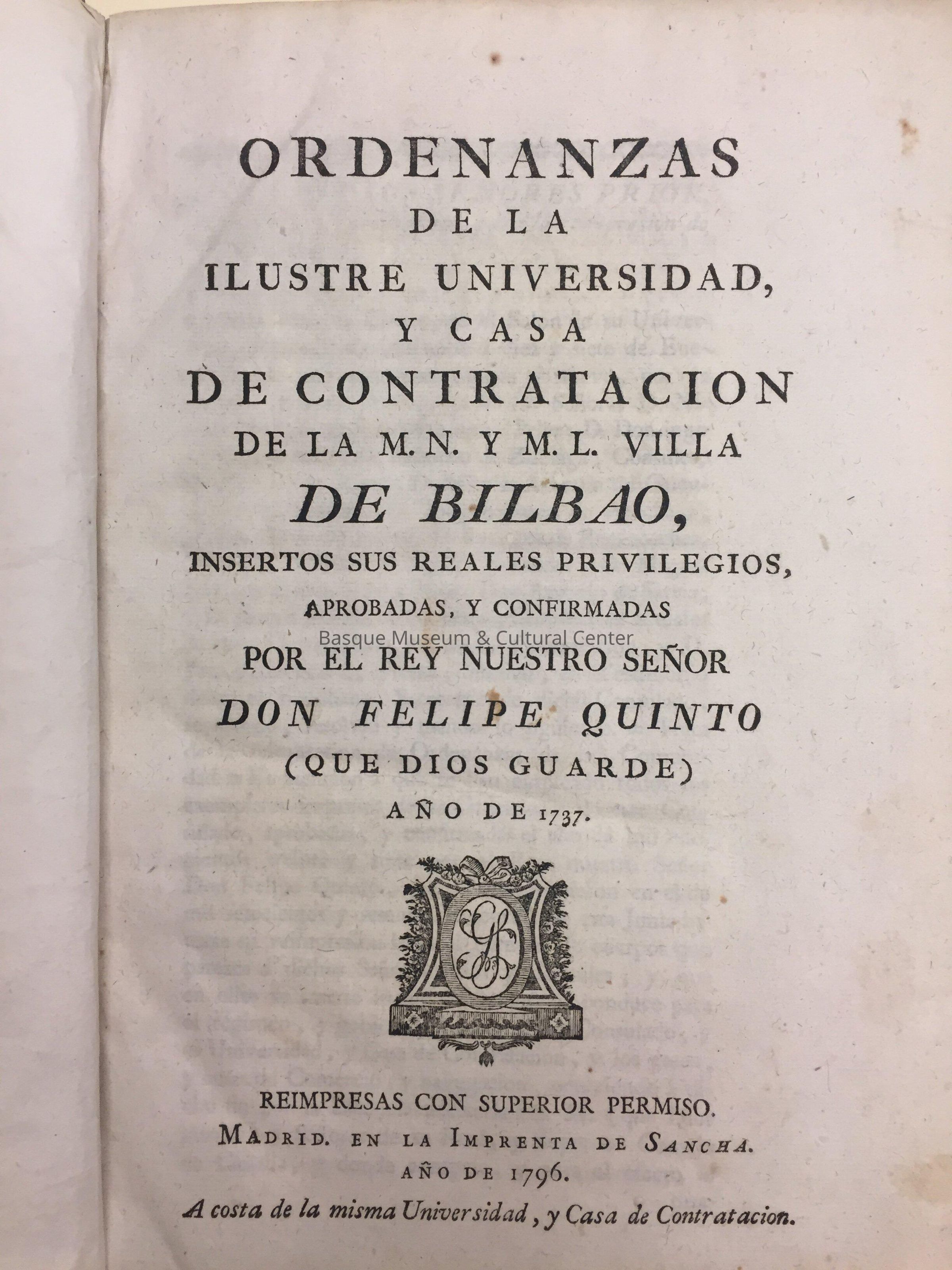 Ordenanzas de la illustre universidad, y casa de contratacion de la M.N.Y.M.L. Villa de Bilbao : (insertos sus reales privilegios) aprobadas, y confirmadas por el rey nuestra senor Don Phelipe Quinto (que dios quarde) ano de 1737.Entry/Object ID